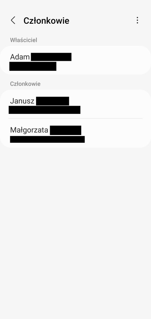 W aplikacji jest możliwość dodawania innych członków systemu (domowników). Aby przejść do tej funkcji, należy w lewym górnym rogu ekranu, kliknąć Ikonę Domu, a następnie Zarządzanie lokalizacjami. Z dostępnych opcji wybieramy Członkowie. W stworzonym inteligentnym domu istnieje już trzech domowników: jeden jako właściciel, i dwóch członków (cenzura wrażliwych informacji). Dzięki dodaniu członków i odpowiednim zezwoleniom na dostęp do lokalizacji można tworzyć procedury ze względu na pobyt bądź opuszczanie przez nich lokalizacji domu.