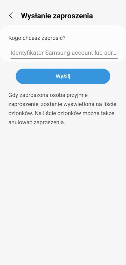 Pojawią się dwie możliwości jego dodania: pierwsza przez konto Samsung account, tutaj domownik musi podać i wprowadzić identyfikator konta. Druga opcja, zdecydowanie łatwiejsza, opiera się o poproszenie osoby dodawanej o zeskanowanie kodu QR w swojej aplikacji SmartThings zainstalowanej na smartfonie. Powyżej przedstawiam screeny z możliwościami dodawania. Ze względów bezpieczeństwa kod QR systemu został zamazany.