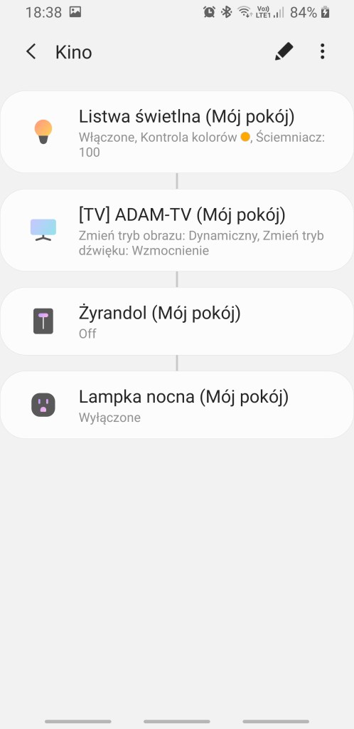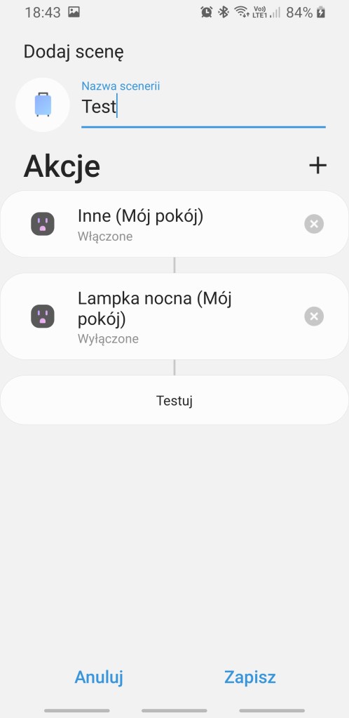 W stworzonym inteligentnym domu istnieje już ich kilka. Stworzenie kolejnej scenerii jest niezwykle łatwe, klikamy „plus”. Następnie nadajemy nazwę, i po kliknięciu w ikonę sceny możemy ją zmienić. W każdej chwili można zmienić nazwę scenerii w późniejszym etapie. W kolejnym oknie musimy wybrać urządzenia do dodania i jaką mają zrealizować czynność (dostępne czynności są szczegółowo opisane w kolejno recenzowanych urządzeniach). Po dodaniu więcej niż dwóch urządzeń możemy zapisać scenę, od tej chwili możemy z niej korzystać.