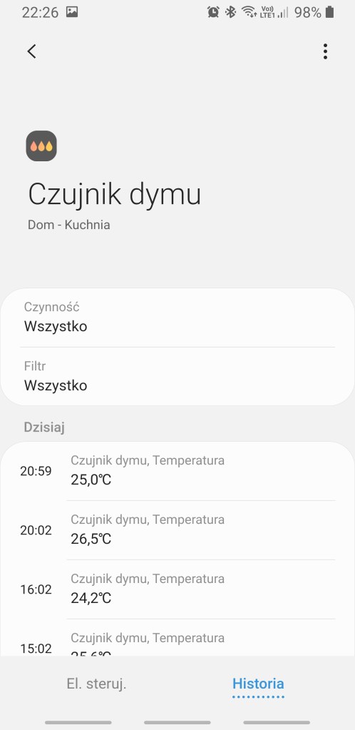 W głównym panelu aplikacji mamy informację czy czujnik wykrył dym „Czysto”/”Wykryto” oraz czy z czujnika została zdjęta pokrywa. Posiadamy informacje o temperaturze oraz procentową informację o baterii. Panel „Historii” nie różni się znacznie od innych urządzeń, mamy dostęp do sortowania i przestudiowania historii działań gniazdka. W ustawieniach „Edytuj” mamy standardową możliwość zmiany nazwy, lokalizacji oraz pokoju. Dodatkowo posiadamy opcje zaawansowane.
