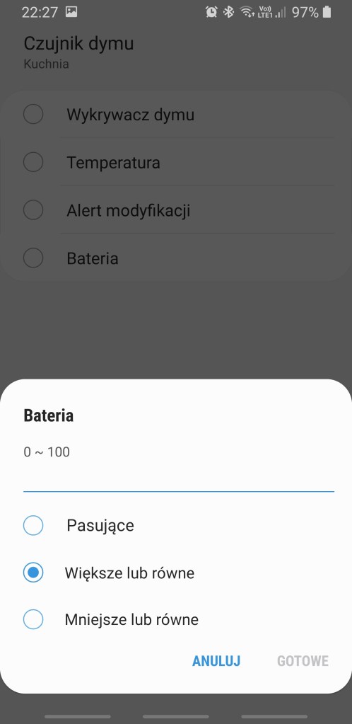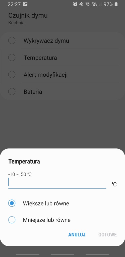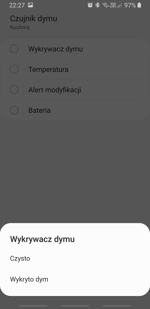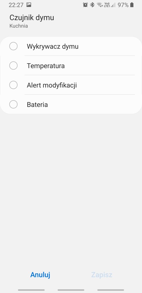 Przy tworzeniu automatyzacji „Jeśli … to Wtedy” urządzenie pozwala nam na wybranie opcji / wysłanie powiadomienia o tym czy czujnik wykrył dym „Czysto”/”Wykryto dym”. Powiadomić nas może o temperaturze z zakresu -20 – 100 w tym czy są większe/mniejsze niż podana oraz o baterii z zakresu 0 – 100% w tym czy są większe/mniejsze niż podana. Alert o modyfikacji sensora.