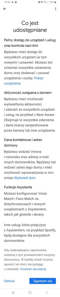 Następnie z telefonu nowego domownika musimy akceptować wysłane zaproszenie w tym celu klikamy powiadomienie, które pojawiło się na belce powiadomień. Wyświetlą nam się szczegóły zaproszenia, kto zaprasza i kogo do jakiej lokalizacji. Potwierdzamy klikając Dalej, następnie zapoznajemy się z tym co zostaje nam udostępnione oraz jakie mamy uprawnienia, stukamy Zgadzam się. Nadajemy nazwę naszej lokalizacji, po chwili ukarze się nam lista urządzeń właściciela domu na naszej aplikacji Google Home.