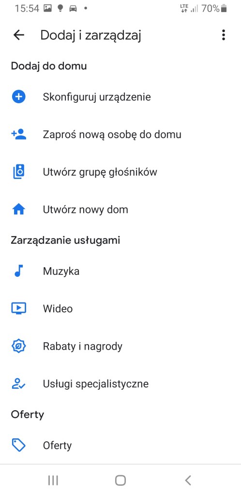 Oczywiście musimy posiadać zainstalowaną na telefonie aplikację Google Home, przy pierwszym uruchomieniu aplikacji przechodzimy przez proces konfiguracji. Klikamy Rozpocznij, wybieramy swoje konto Google, następnie stuknij OK i znów Rozpocznij. Nadajemy nazwę naszemu inteligentnemu domowi, zatwierdź klikając Dalej. Wpisujemy adres domowy i nadajemy dostęp do lokalizacji GPS. Nastąpi szukanie urządzeń w pobliżu, przerywamy operację dodawania, klikając Nie teraz. Pojawi nam się główny panel aplikacji Google Home.