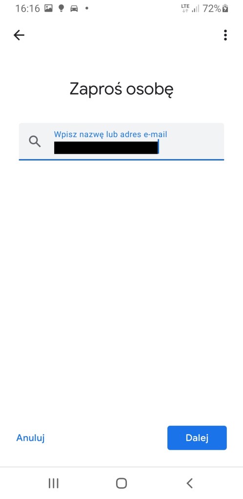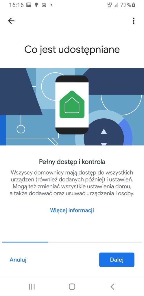 W pierwszej kolejności musimy wysłać zaproszenie do naszego domu. Robimy to z poziomu smartfonu właściciela inteligentnego domu – osoby która go konfigurowała na początku. W tym celu kliknij przycisk Dodaj ( + ) w górnym lewym rogu ekranu lub skorzystaj z Zaproś do domu nową osobę. Wpisujemy adres mailowy nowego członka, klikamy Dalej. Zapoznajemy się z tym jaki dostęp przyznajemy domownikowi, zatwierdzamy klikając kilka razy Dalej. Na koniec mamy podsumowanie zaproszenia i kończymy stukając Zaproś.