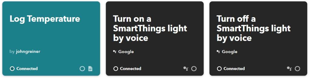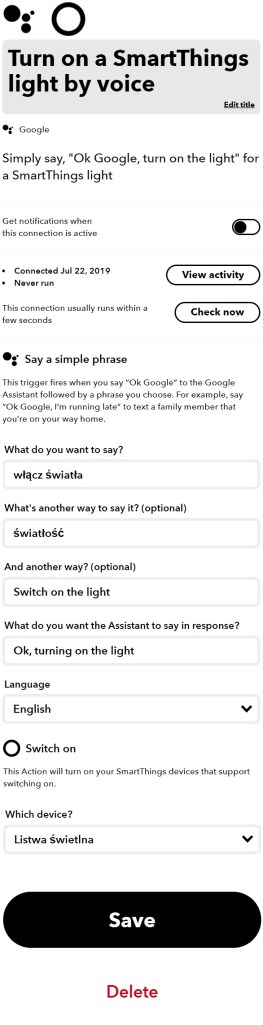 W stworzonym inteligentnym domu wykorzystałem IFTTT do sterowania oświetlaniem głosowo, skorzystałem z „Turn on/off SmartThings light by voice”. Poniżej przedstawiam przykładową konfigurację.