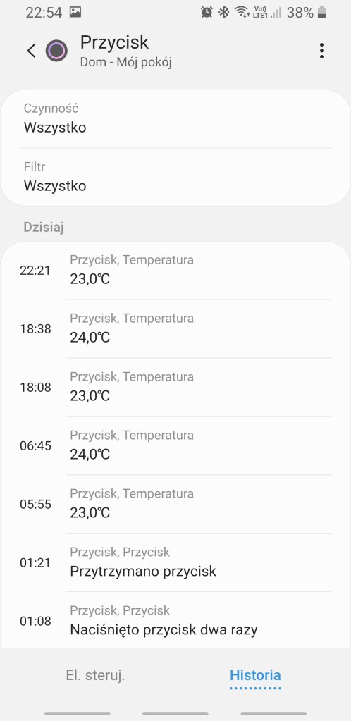 W głównym panelu aplikacji mamy możliwość zaprogramowania pojedynczego i podwójnego naciśnięcia oraz przytrzymania. Dostajemy informację o temperaturze, co ciekawe mamy dodatkową opcję w ustawieniach w celu korekty mierzonej przez czujnik temperatury. Panel „Historii” również nie różni się znacznie od innych urządzeń, mamy dostęp do sortowania i przestudiowania historii działań przycisku. W ustawieniach „Edytuj” mamy standardową możliwość zmiany nazwy, lokalizacji oraz pokoju.