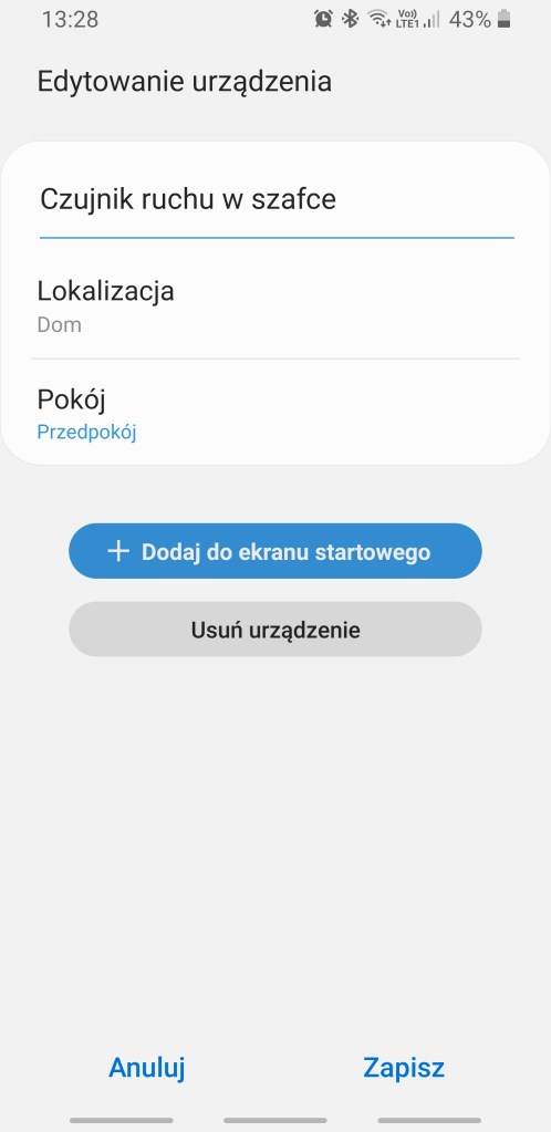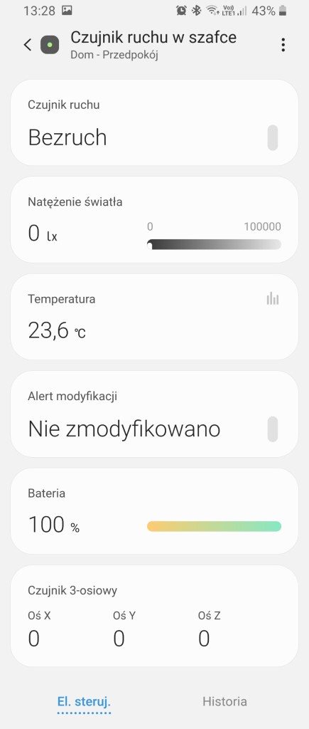W głównym panelu aplikacji SmartThings mamy informację czy czujnik wykrył ruch „Bezruch”/”Wykryto ruch”, informację o bieżącym natężeniu światła w luksach (lx), temperaturę, czy czujnik w danej chwili ma zdjętą pokrywę. Informuje o procentowym zużyciu baterii. Ostatnią informacja jest czujnik 3-osiowy – informujący o poruszeniu się. Panel „Historii” nie różni się znacznie od innych urządzeń, mamy dostęp do sortowania i przestudiowania historii działań sensora. W ustawieniach „Edytuj” mamy standardową możliwość zmiany nazwy, lokalizacji oraz pokoju. Dodatkowo posiadamy opcje zaawansowane, gdzie możemy dostosować czułość urządzenia, czy wyłączyć diodę LED.