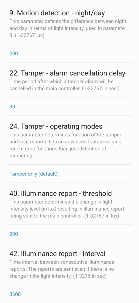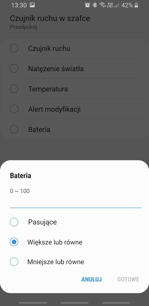 Przy tworzeniu automatyzacji „Jeśli … to Wtedy” urządzenie pozwala nam na wybranie opcji / wysłanie powiadomienia o tym czy czujnik wykrył „Bezruch”/”Wykryto ruch”. Wykonanie działań po stwierdzeniu natężenia światła z zakresu 0-32000 w tym czy są większe/mniejsze niż podana. Powiadomić nas może o temperaturze z zakresu -20 – 100 w tym czy są większe/mniejsze niż podana oraz o baterii z zakresu 0 – 100% w tym czy są większe/mniejsze niż podana. Alert o modyfikacji sensora. Czujnik dzięki aż tylu możliwością potrafi uruchomić nawet najbardziej złożone sekwencje np. sterowania światłem.