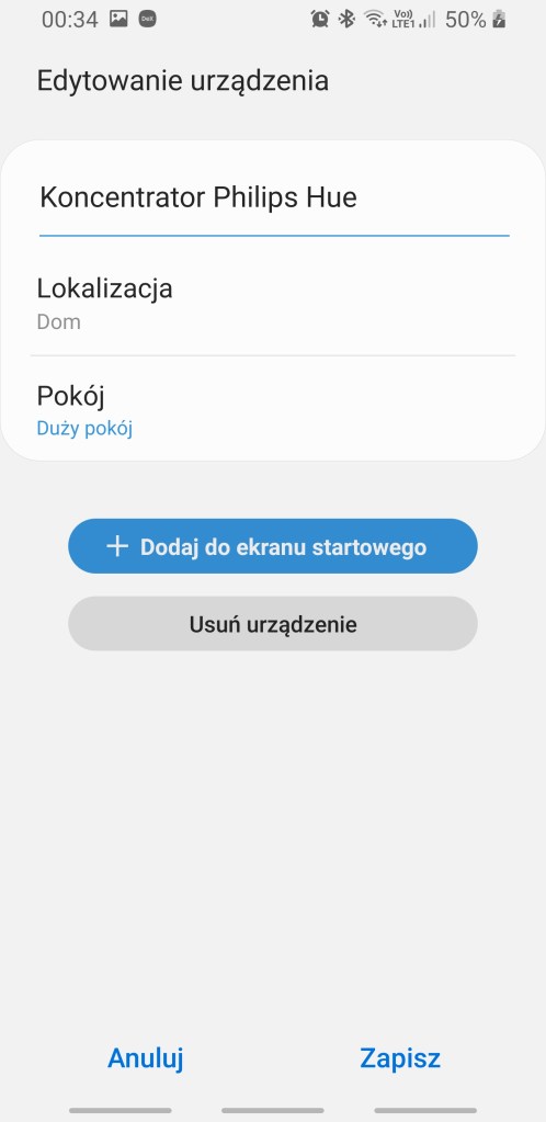 Uwaga usunięte zostaną wszystkie inne urządzenia będące w aplikacji Hue, jeśli chcemy pozbyć się tylko jednego urządzenia należy je usunąć z aplikacji SmartThings, poprzez panel sterowania, ustawienia „Edytuj”. Aby więcej nie zostało wykryte przez SmartThings należy je również usunąć z aplikacji Hue.