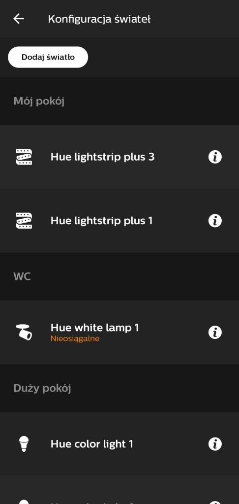 - Wyświetlona zostanie lista wszystkich świateł z aplikacji Hue. Klikamy Gotowe, kończąc proces instalacji.