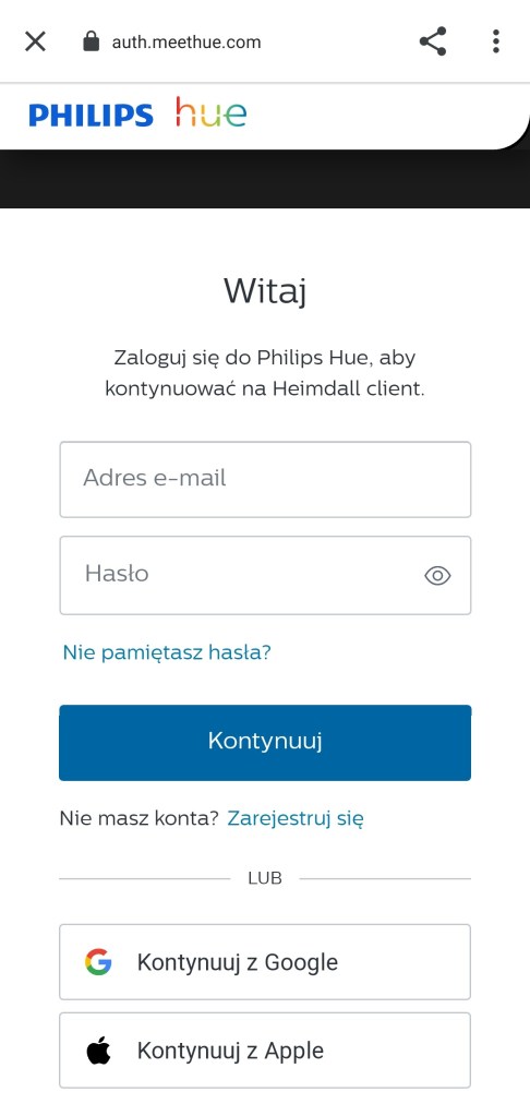 - Zostaniemy poproszeni o zalogowanie się do swojego konta Philips Hue, tym samym co w aplikacji Hue. Zatwierdzamy klikając Kontynuuj.