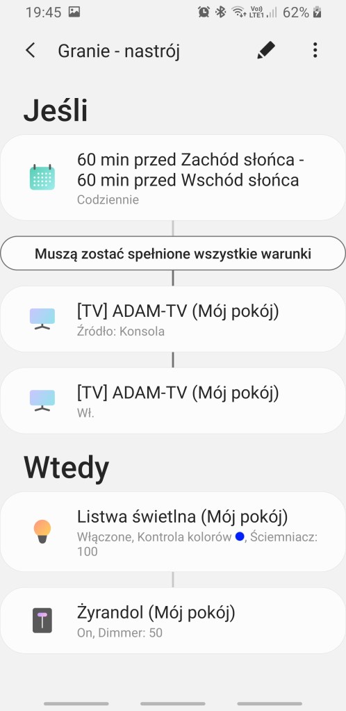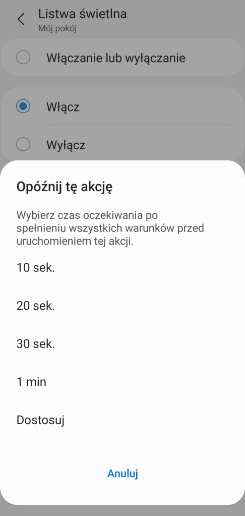 Tworzenie automatyzacji „Jeśli … to Wtedy” musimy podzielić na dwa etapy, ponieważ znacznie różnią się dostępne opcje jeśli inicjujemy warunek „Jeśli”. W pierwszej możliwości „Jeśli” urządzenie pozwala na wybranie opcji „Włączono lub wyłączono” czyli zmiana stanu, oraz „Włączone” i „Wyłączone”. Jak i wartość ściemniacza i temperatury kolorów. W drugiej możliwości „Wtedy”, listwa pozwala na dużo więcej, mamy pełną możliwość tworzenia opcji przydatnych w programowaniu już np. scenerii. I tak mamy ponownie opcje „Włączono lub wyłączono” czyli zmiana stanu, oraz „Włączone” i „Wyłączone”. Ustawienie jednego z 16 milionów kolorów, jasności listwy z zakresu 0 – 100%, bądź temperatury kolorów z zakresu 2000 – 6500 K. Akcję uruchomienia listwy możemy opóźnić o dowolny czas, jak i wyłączyć listwę automatycznie po ustalonym czasie.