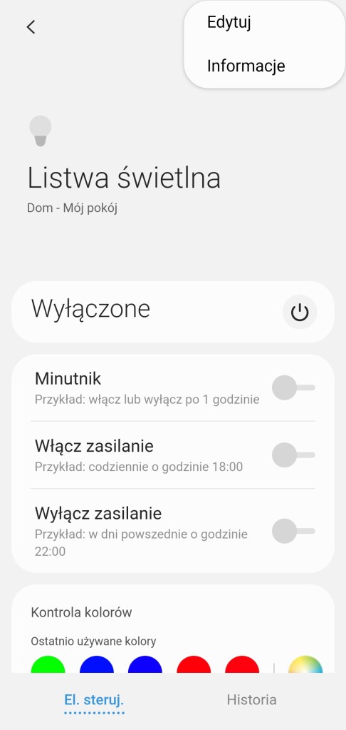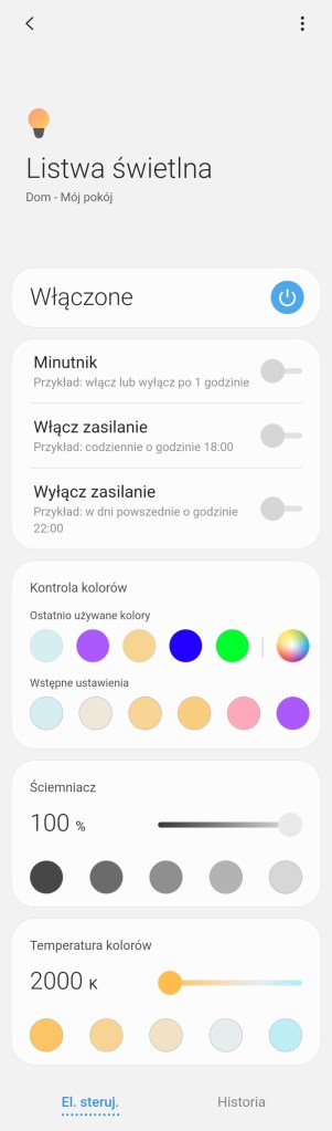 W głównym panelu aplikacji mamy możliwość zaprogramowania szybkich automatyzacji: włączenia i wyłączenia listwy LED oraz np. minutnika. Dostępna jest pełna paleta kolorów, ustawienie (ściemniacza) jasności listwy świetlnej, jak i temperatury kolorów. Panel „Historii” również nie różni się znacznie od innych urządzeń, mamy dostęp do sortowania i przestudiowania historii działań listwy. W ustawieniach „Edytuj” mamy standardową możliwość zmiany nazwy, lokalizacji oraz pokoju.