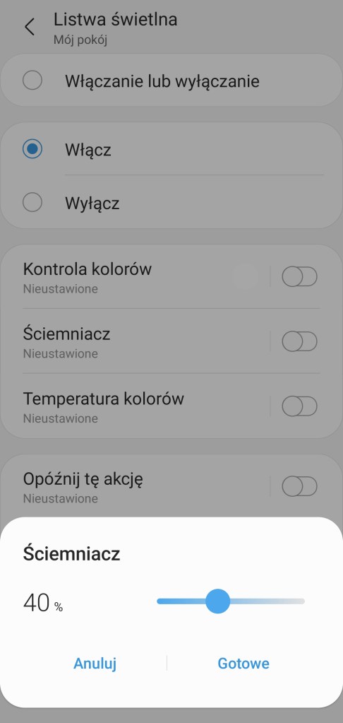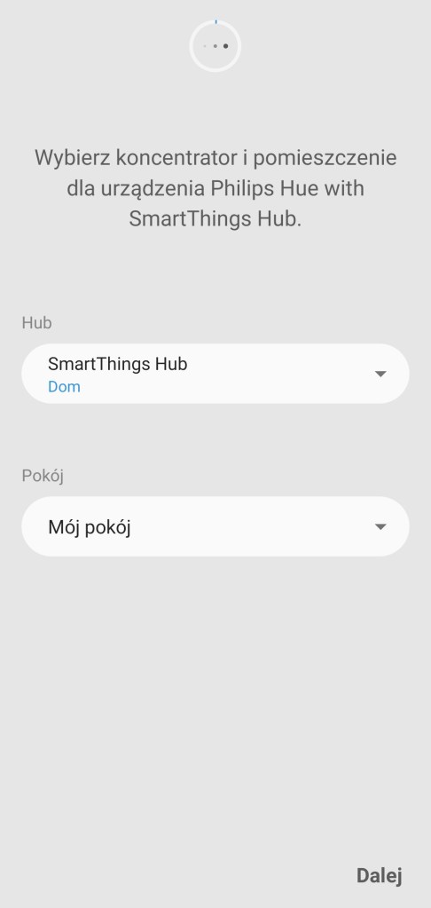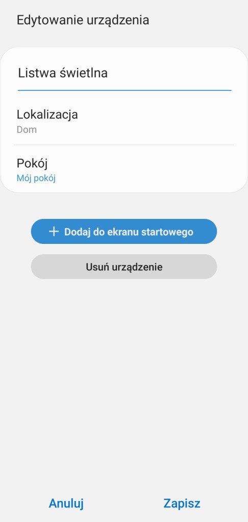 Po dodaniu urządzenia w aplikacji Philips Hue, możemy przystąpić do dodania taśmy świetlnej do ekosystemu SmartThings. Przechodzimy do aplikacji SmartThings, na ekranie głównym aplikacji, klikamy „plus”, kolejno „Urządzenie”, znajdujemy markę Philips Hue >> Oświetlenie. I dodanie poprzez „Philips Hue with SmartThings Hub”, klikamy „Rozpocznij”, uruchamiając proces konfiguracji. Wybieramy hub i pokój dla urządzenia. Po chwili nowe listwa zostanie wyszukana. Taśma się zaświeci, na koniec mamy możliwość zmiany nazwy przykładowo „Listwa świetlna”, kończymy proces instalacji, klikając „Gotowe”.