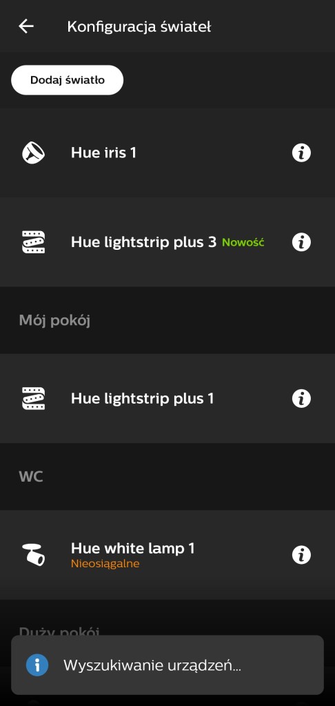 Jeśli posiadamy mostek Hue i centralę SmartThings możemy przejść do instalacji. W pierwszej kolejności musimy połączyć nową listwę z mostkiem i aplikacją Philips Hue. W pierwszej kolejności musimy pobrać aplikację z Google Store bądź AppStore (iOS 12.0 lub nowszy). Po zainstalowaniu aplikacji, uruchamiamy ją. Aby wyszukać nowe urządzenie, musimy przejść do ustawień aplikacji (klikając trzy kropki) w prawym górnym rogu ekranu. Z dostępnych ustawień, kliknij „Konfiguracja świateł”, następnie „Dodaj światło”. Należy upewnić się czy listwa świetlna podłączona jest do zasilania. Mamy możliwość dodania poprzez wpisanie numeru seryjnego (znajduje się on na urządzeniu) lub poprzez wyszukanie, klikamy „Wyszukaj”. Po chwili zostanie wykryta nowa listwa świetlna i dodana do listy. Nowo dodane urządzenia posiadają dopisek „Nowość”.