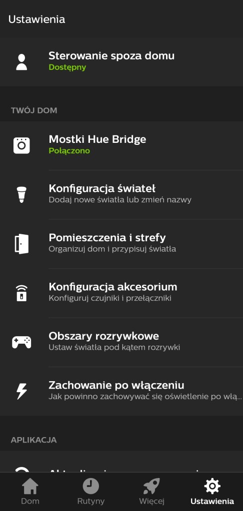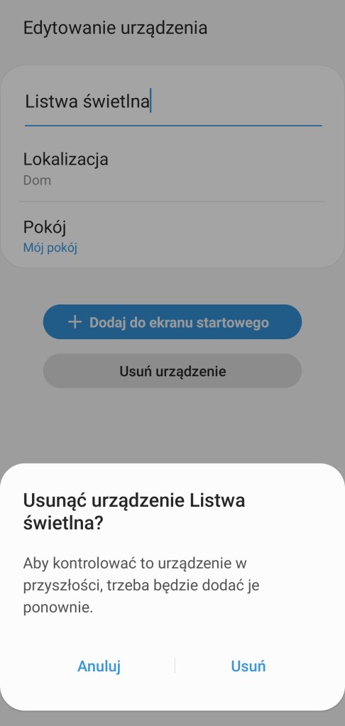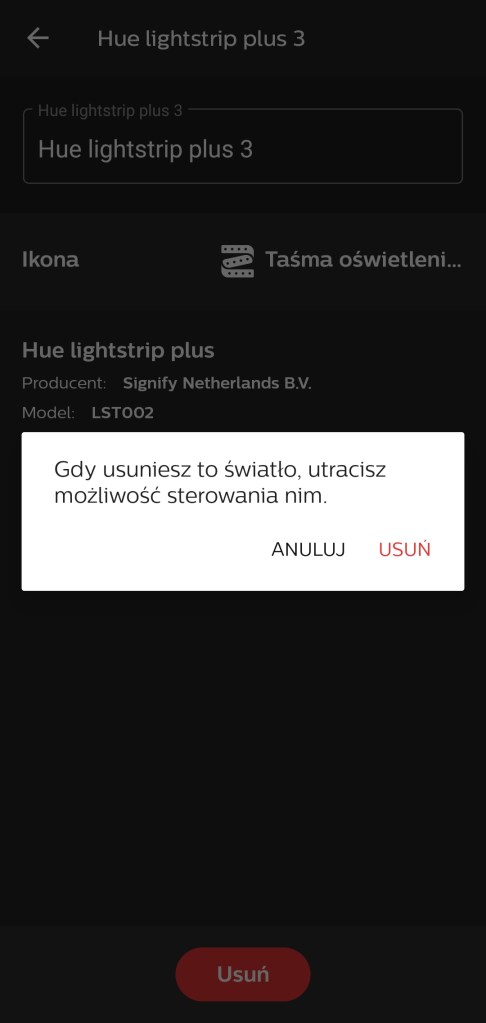 Aby uniknąć ponownego wyszukania urządzenia przez aplikację SmartThings, należy również usunąć listwę LED z aplikacji Philips Hue. W tym celu otwieramy aplikację Hue, przechodzimy do ustawień (prawy dolny róg). Z wyświetlonej listy wyszukujemy taśmę, aby upewnić się, że usuwamy odpowiednią lampę możemy kliknąć na nazwę a listwa mrugnie nam światłem. Aby usunąć klikamy ikonę informacji ( i ), następnie Usuń. Potwierdzamy klikając Usuń.