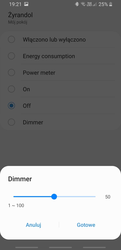 W drugiej możliwości „Wtedy”, ściemniacz pozwala na troszkę mniej opcji, mamy ponownie opcje „Włączono lub wyłączono” czyli zmiana stanu, oraz „Włączone” i „Wyłączone”. Ustawienie jasności oświetlenia. Możemy opóźnić akcję lub wyłączyć automatycznie po określonym czasie.