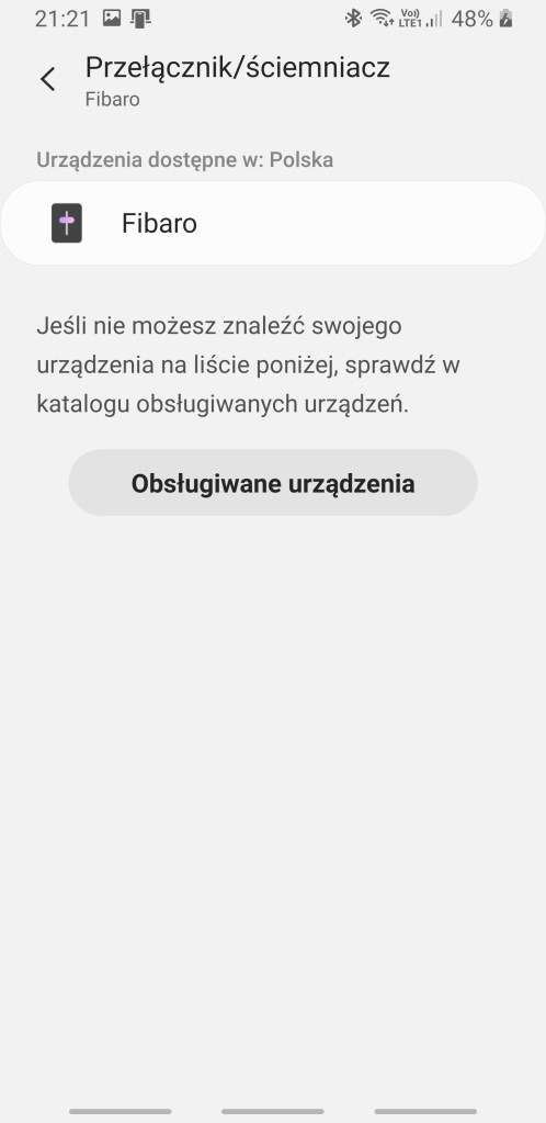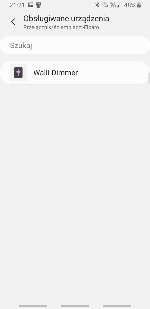 Po dodaniu kodu niestandardowej obsługi, możemy przejść do dodania łączenia ściemniacza z centralą. Dodanie do ekosystemu już przebiega standardowo, należy postępować zgodnie z instrukcją w aplikacji. Klikamy w aplikacji „Dodaj urządzenie”, wybieramy markę FIBARO >> Przełącznik/ściemniacz. Wybieramy „Obsługiwane urządzenia” i Walli Dimmer. Kontynuujemy pierwsze kroki, wybieramy koncentrator i pomieszczenie dla urządzenia. Następnie naciskamy 3 razy przycisk (górny bądź dolny) ściemniacza. Poczekać na wykrycie urządzenia i pozostaje nadać nazwę.