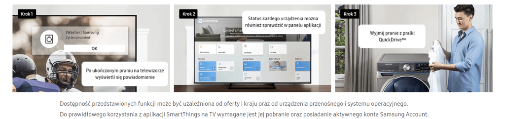 W nowych modelach telewizorów Samsung jest przeinstalowana aplikacja SmartThings. Pozwala otrzymywanie powiadomień bezpośrednio na ekranie TV, wyświetlenie statusu urządzeń w inteligentnym domu oraz na sterowanie nimi.