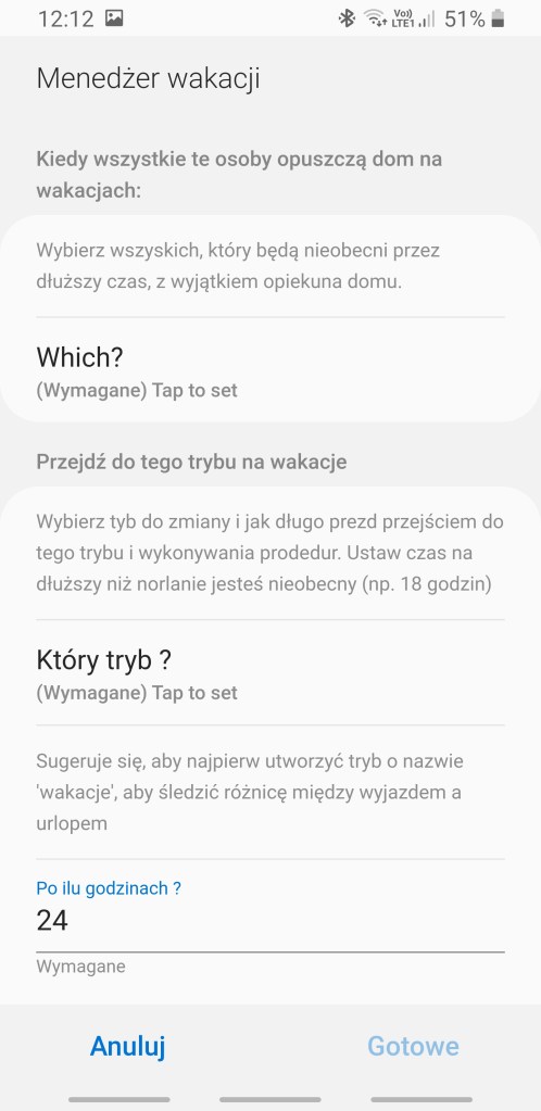 Zmień na ten tryb na wakacje – po ilu godzinach? Zamiarem aplikacji jest przejście do trybu wakacyjnego po nieobecności przez okres dłuższy niż zwykle, na przykład ponad 18 godzin. Jeśli chcesz, aby tryb był aktywowany wcześniej, możesz ustawić go na niższą tolerancję, ale pamiętaj, że ma on działać po tym, jak „Smart Home Monitor” ustawia Cię jako „poza domem” i uzbroi ekosystem.