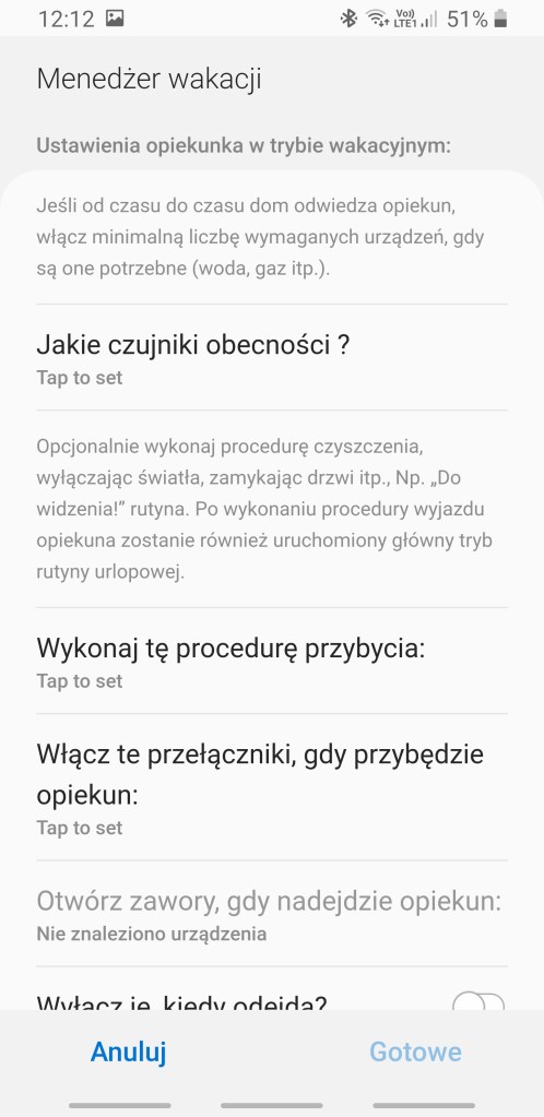 paragraph "Opcjonalnie wykonaj procedurę czyszczenia, wyłączając światła, zamykając drzwi itp., Np. „Do widzenia!” rutyna. Po wykonaniu procedury wyjazdu opiekuna zostanie również uruchomiony główny tryb rutyny urlopowej."