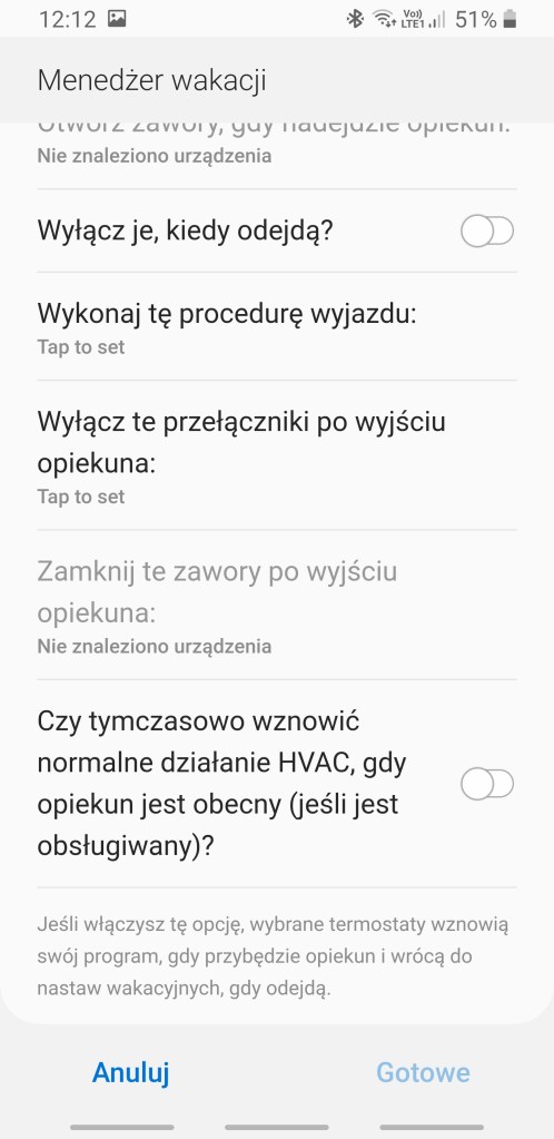 paragraph "Dostosuj ustawienia HVAC podczas wakacji. Może to zastępować lub uzupełniać dowolną rutynę urlopową wykonaną powyżej."
