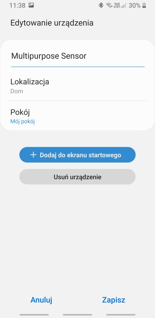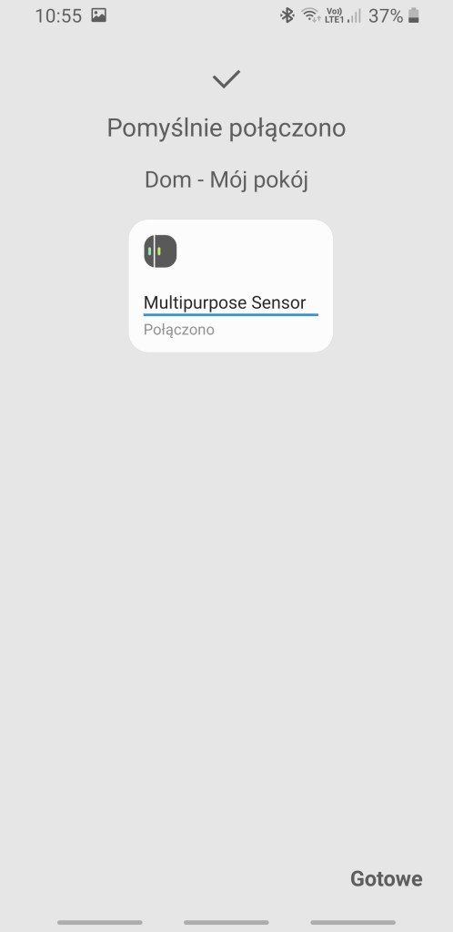 Dodanie do ekosystemu jest proste należy postępować zgodnie z instrukcją w aplikacji. Klikamy w aplikacji „Dodaj urządzenie”, wybieramy markę SmartThings >> Czujnik wielofunkcyjny i model urządzenia. Czekamy na przygotowanie konfiguracji. Kontynuujemy pierwsze kroki, wybieramy koncentrator i pomieszczenie dla urządzenia. Tutaj mamy możliwość zeskanowania kodu z tyłu urządzenia bądź pominięcia tego kroku. Musimy teraz wyciągnąć taśmę z czujnika. Poczekać na wykrycie czujnika, pozostaje już tylko nadać nazwę sensorowi i kliknąć „Gotowe”.