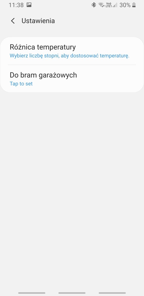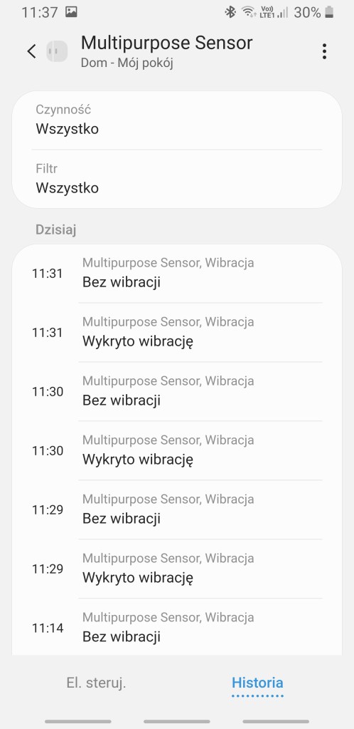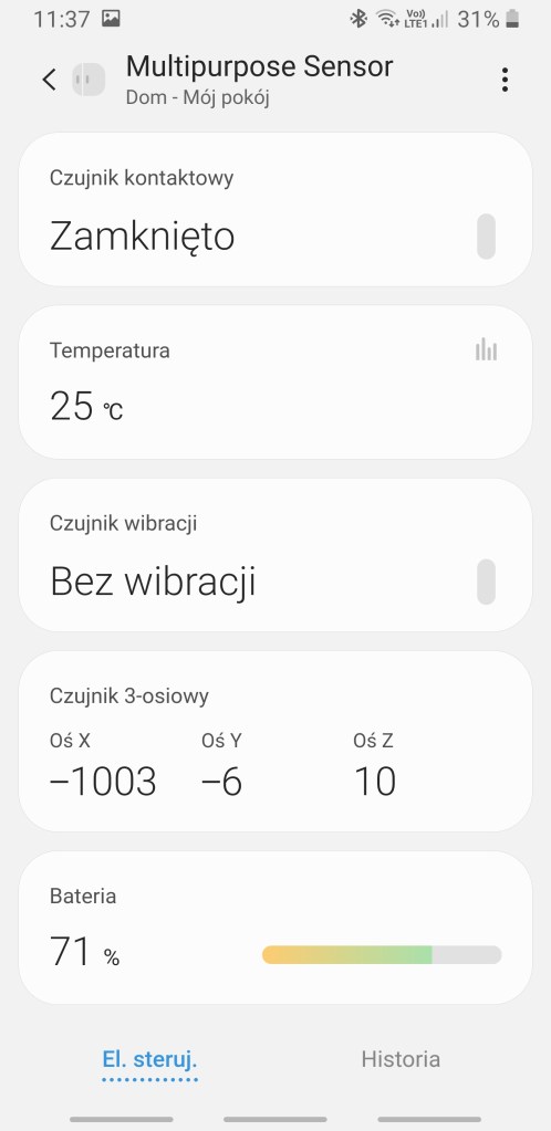 W głównym panelu aplikacji SmartThings mamy informację czy czujnik „Otwarto”/„Zamknięto”. Informacje o temperaturze, alert o wykryciu wibracji, czujnik żyroskopowy oraz procentową informację o baterii. Panel „Historii” również nie różni się znacznie od innych urządzeń, mamy dostęp do sortowania i przestudiowania historii działań sensora. W ustawieniach „Edytuj” mamy standardową możliwość zmiany nazwy, lokalizacji oraz pokoju. W dodatkowych opcjach posiadamy możliwość korygowania temperatury oraz czy czujnik wykorzystujemy w bramie garażowej.