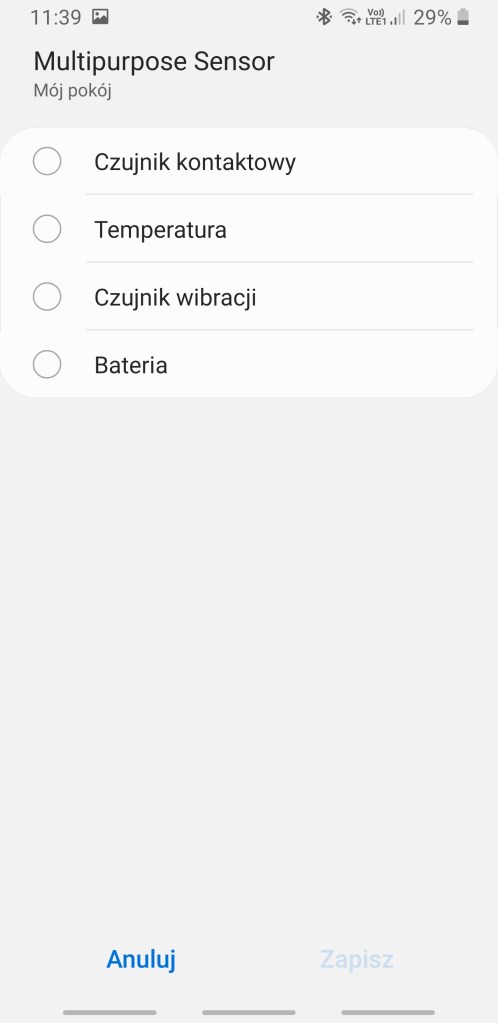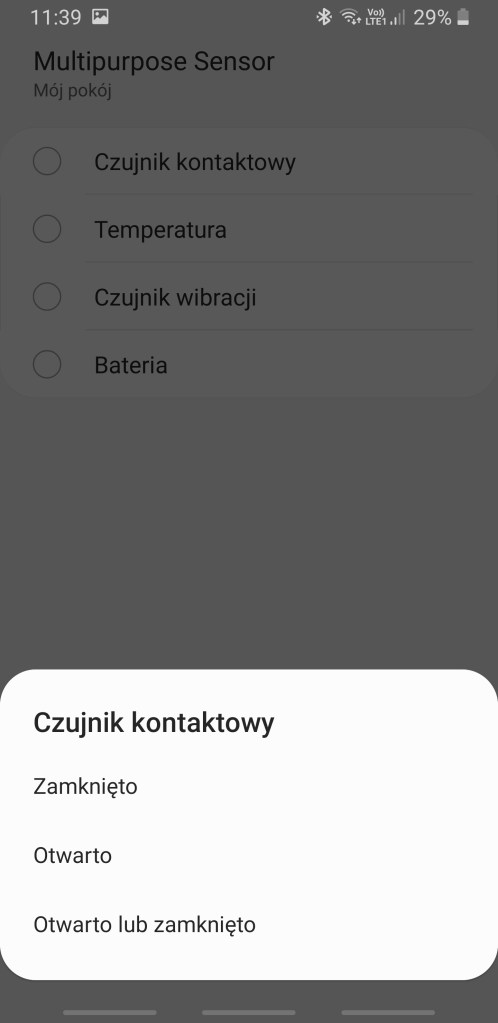 Przy tworzeniu automatyzacji „Jeśli … to Wtedy” urządzenie pozwala nam na wybranie opcji / wysłanie powiadomienia o tym czy czujnik „Otwarto”/„Zamknięto”/ „Otwarto lub Zamknięto”. Powiadomić nas może o temperaturze z zakresu -20 – 100 w tym czy są większe/mniejsze niż zadana. Czy została wykryta wibracja w czujniku. Informacja o baterii z zakresu 0 – 100% w tym czy są większe/mniejsze niż podana.