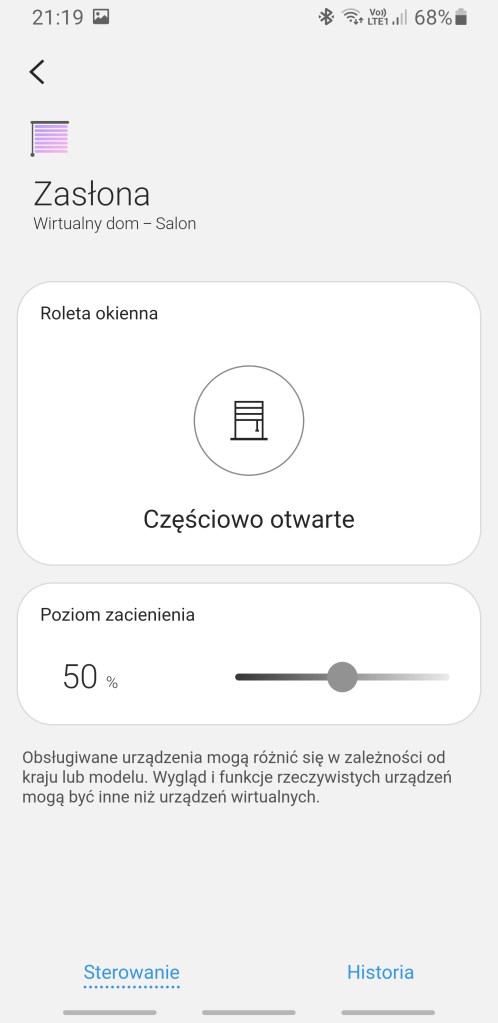 Aby wejść do wirtualnego domu, należy w aplikacji rozwinąć lewe menu, i klikając „Sposób użycia”. W tym miejscu mamy dostępne mini-przewodniki na temat tworzenia automatyzacji, scenerii, urządzeń i wiele innych. Klikamy pierwszy z góry kafelek, który krótką instrukcję i ukaże główny panel z wirtualnymi urządzeniami.