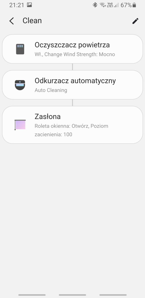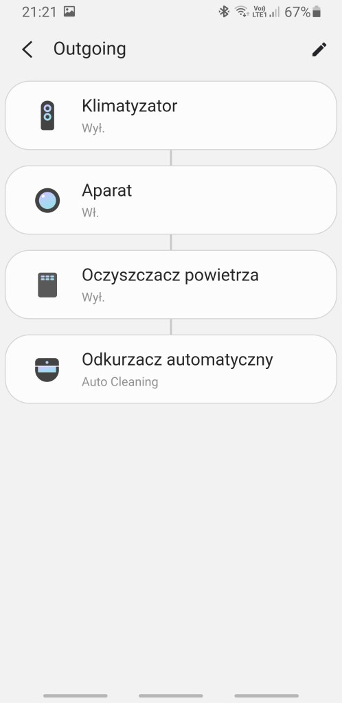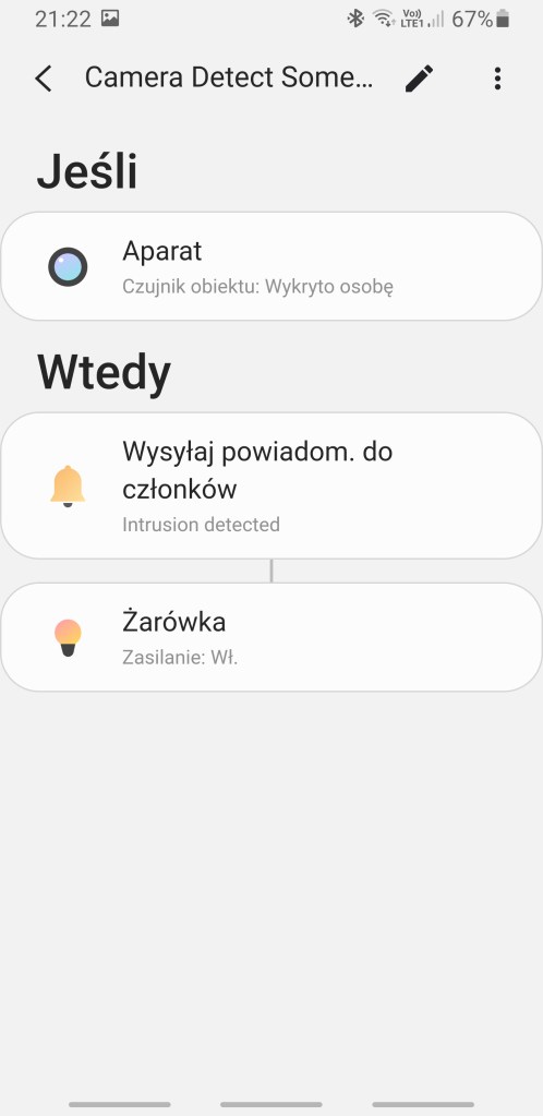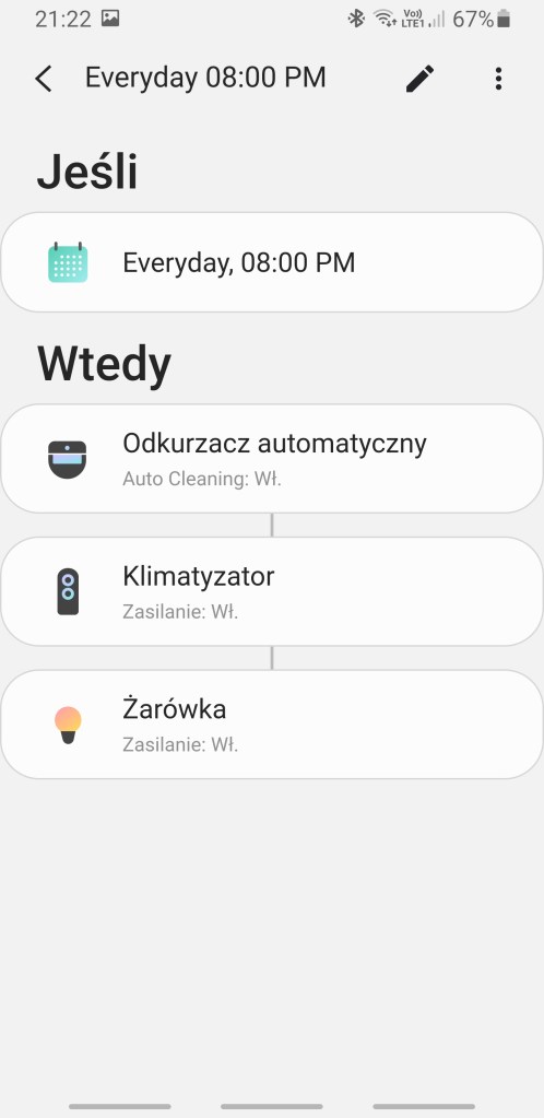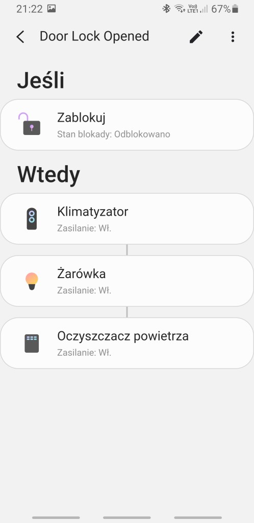 Zaprogramowano również kilka przykładowych automatyzacji. Pierwsza odpowiada za wykrycie zalania, powiadomi domowników i wyłączy urządzenia. Druga po wykryciu osoby w domu, włączy światło i powiadomi użytkowników. Kolejna po odblokowaniu drzwi, włączy klimatyzator, żarówkę i oczyszczacz powietrza. Następna każdego dnia o 20:00, włącz urządzenia. Ostatnia odpowiada za rozsłoneczniacie pomieszczenia każdego dnia o 7:00 i uruchomienie odkurzacza i klimatyzacji.