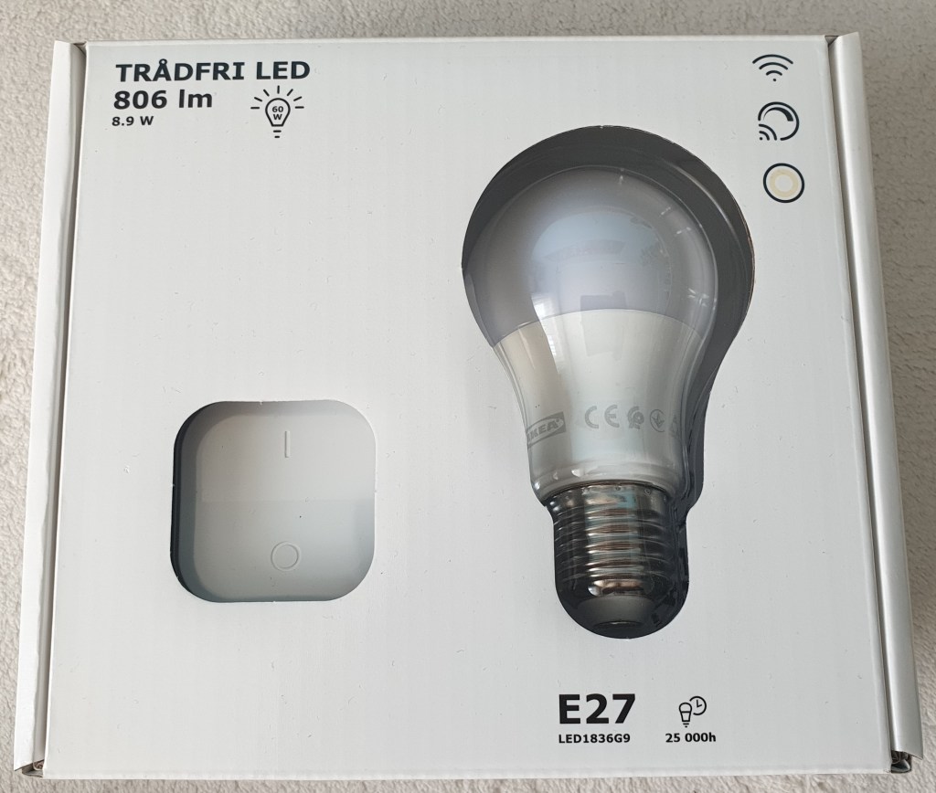 IKEA TRÅDFRI to żarówka LED o stałej barwie światła na poziomie 2700 kelwinów dającą barwę ciepłą. Posiadamy dodatkowo tylko możliwość ściemniania w zakresie 0 – 100%. Żarówka daje maksymalną jasność 806 lm. Komunikacja odbywa się po protokole Zigbee, bezpośrednio z centralą SmartThings. Gwint w tym przypadku to E27, moc na poziomie 8,9W (odpowiednik tradycyjnej żarówki 60W). Zużycie prądu w trybie czuwania to 0,5W. Żywotność to aż 25 000 godzin oraz 25 000 cyklów przełączania. Posiada klasę energetyczną A+. Wysokość to standardowo 11 cm, a średnica 60 mm.