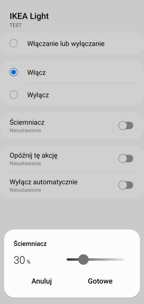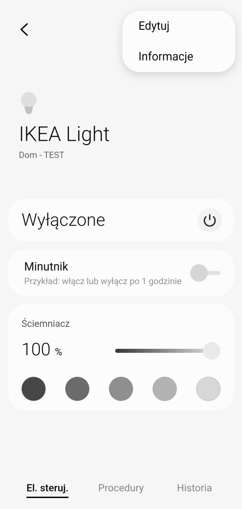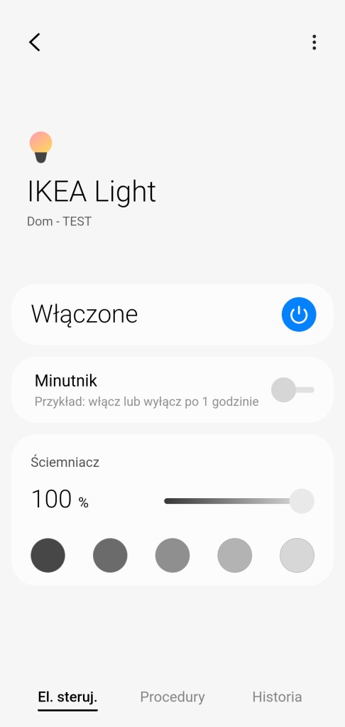 W głównym panelu urządzenia mamy możliwość włączenia/wyłączenia żarówki IKEA oraz możliwość ustawienia minutnika. Poniżej posiadamy możliwość ustawienia ściemniacza od 1 do 100%. Pod ściemniaczem posiadamy również pięć kół, będących przyciskami ustawiającymi ściemniacz na kolejno od lewej 10%, 30%, 50%, 70% oraz 90% jasności. Na dole znajdziemy sekcję panel „Procedury” (dawniej „Automatyzacje„) znajdziemy tutaj szybkie procedury: włączenia i wyłączenia żarówki o danej porze dnia oraz listę procedur gdzie używane jest urządzenie. Panel „Historii” nie różni się znacznie od innych urządzeń, mamy dostęp do sortowania i przestudiowania historii działań żarówki. W ustawieniach „Edytuj” mamy standardową możliwość zmiany nazwy, ikony, lokalizacji, pokoju oraz możliwość dodania do panelu „Ulubione”.
