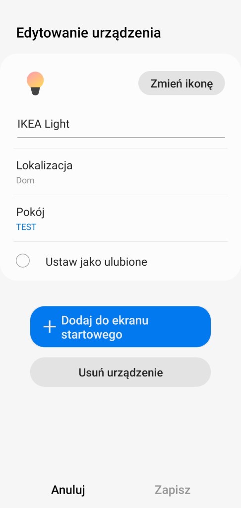 Dodanie do ekosystemu jest proste należy postępować zgodnie z instrukcją w aplikacji SmartThings. Klikamy na ekranie głównym przycisk Dodaj ( + ), w prawym górnym rogu ekranu. Następnie Urządzenie, przesuwamy w dół do sekcji marek Wybór z listy urządzeń, wyszukujemy markę IKEA, wybieramy Oświetlenie, z dostępnej listy wybieramy IKEA. Kontynuujemy pierwsze kroki, wybierając centralę i pomieszczenie, w jakim ma się zaleźć urządzenie. Następnie szybko włączamy i wyłączamy zasilanie żarówki 6 razy. Po dodaniu do ekosystemu żarówka LED przestanie migać. Pomyślnym dodaniu możemy zmienić nazwę. Kończymy proces instalacji, klikając Gotowe.