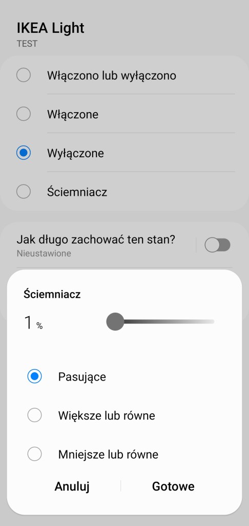 Tworzenie procedur (dawniej automatyzacje) „Jeśli … to Wtedy” musimy podzielić na dwa etapy, ponieważ znacznie różnią się dostępne opcje, jeśli inicjujemy warunek „Jeśli”. W pierwszej możliwości „Jeśli” urządzenie pozwala na wybranie opcji „Włączono lub wyłączono” czyli zmiana stanu, oraz „Włączone” i „Wyłączone”. Dodatkowo posiadamy opcję jak długo zachowany powinien być stan przed uruchomieniem automatyzacji oraz czy ma być to warunek wstępny. W drugiej możliwości „Wtedy”, żarówka pozwala na dużo więcej, mamy ponownie opcje „Włączono lub wyłączono” czyli zmiana stanu, oraz „Włączone” i „Wyłączone”. Ustawienie jednego z poziomów jasności żarówki z zakresu 0 – 100%. Akcję uruchomienia lampy możemy opóźnić o dowolny czas, jak i wyłączyć ją automatycznie po ustalonym czasie.