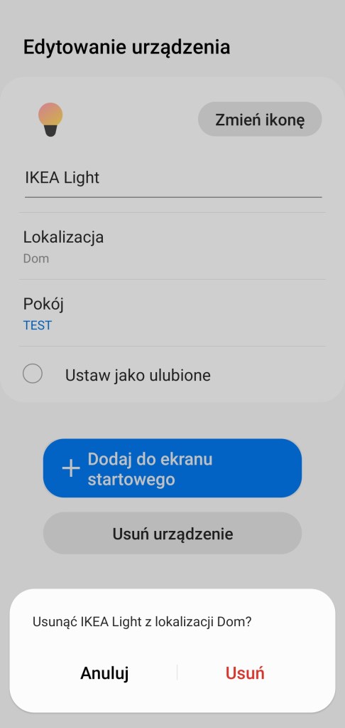 Aby usunąć żarówkę z ekosystemu SmartThings, należy wejść w główny ekran urządzenia. Kliknąć Więcej opcji ( ⋮ ) w prawym górnym rogu ekranu, a następnie Edytuj. W panelu edycji, wybieramy Usuń urządzenie. Następnie potwierdzamy operację, stukając Usuń.