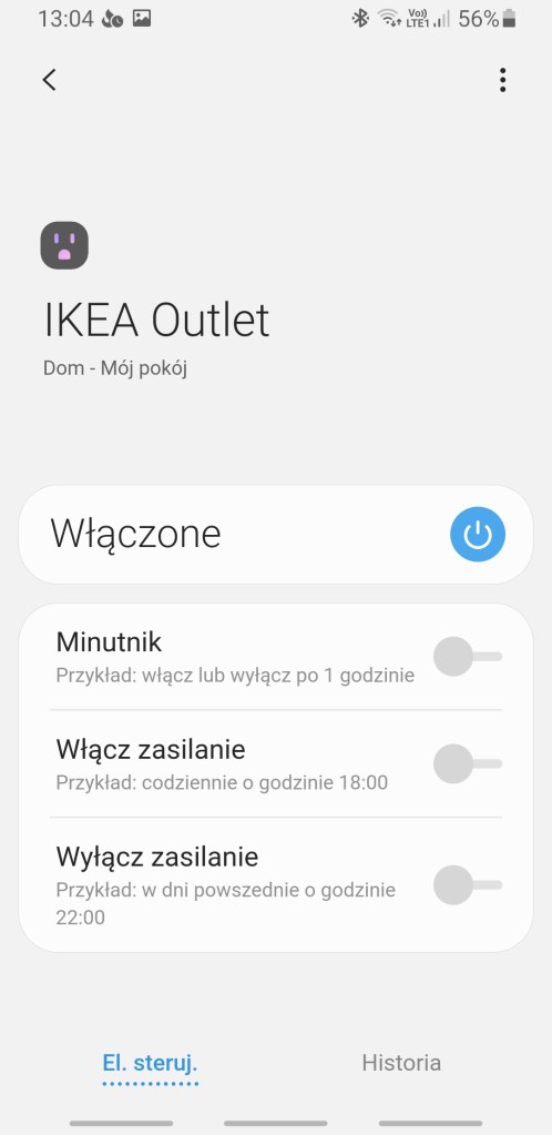 W głównym panelu aplikacji mamy prostą możliwość włączenia i wyłączenia gniazdka oraz możliwość uruchomienia szybkich automatyzacji np. minutnika. Panel „Historii” również nie różni się znacznie od innych urządzeń, mamy dostęp do sortowania i przestudiowania historii działań gniazdka. W ustawieniach „Edytuj” mamy standardową możliwość zmiany nazwy, lokalizacji oraz pokoju.
