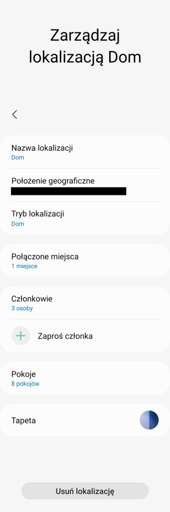 UWAGA: Usunięcie lokalizacji spowoduje przywrócenie wszystkich dołączonych koncentratorów do ustawień fabrycznych. Wszystkie połączenia urządzeń, automatyzacje, sceny, konfiguracje i SmartApps powiązane z lokalizacją zostaną trwale usunięte . Wszystkie urządzenia podłączone do twojego koncentratora będą musiały zostać zresetowane lub wykluczone, zanim będzie można je ponownie podłączyć.