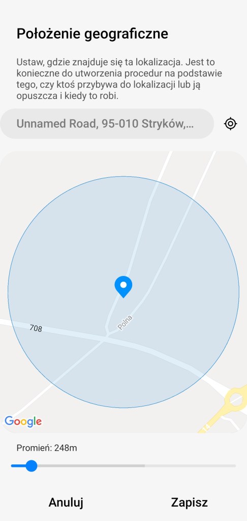 Tym samym rozbudowujemy możliwości automatyzacji o wykonywanie czynności kiedy jesteśmy przykładowo na terenie naszej pracy. Poniżej przedstawiam proces i przykład takiej automatyzacji. W celu oszczędności na ogrzewaniu obniżam temperaturę w domu do 19°C, kiedy jestem w pracy.