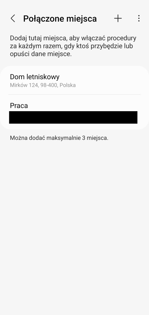 Dodatkowo do aplikacji możemy dodać dodatkowe 3 miejsca, aby aktywować procedurę. Znajdziemy je w Zarządzaj lokalizacją, następnie Połączone miejsca. Umożliwia to użycie swojej lokalizacji lub dowolnego z połączonych miejsc, w celu utworzenia procedur opartej o przybycie lub opuszczenie wybranego miejsca, np. miejsca pracy. Poniżej przedstawiam dodawanie do ekosystemu lokalizacji „Domek letniskowy”.