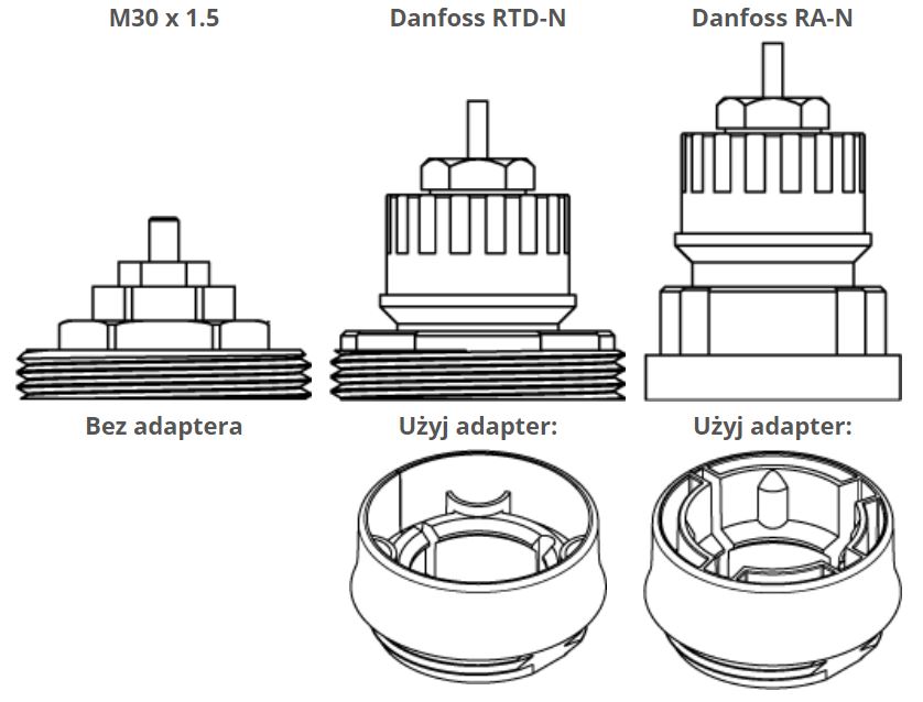Przechodząc do montażu, instalacja jest prosta i nie wymaga użycia narzędzi. Oczywiście przed należy zdemontować dotychczas używaną głowicę termostatyczną. W zależności od typu zaworu, należy użyć odpowiedniego adaptera (dołączonego do zestawu):