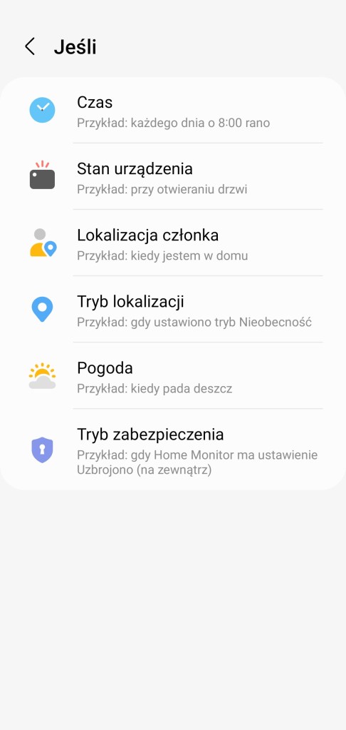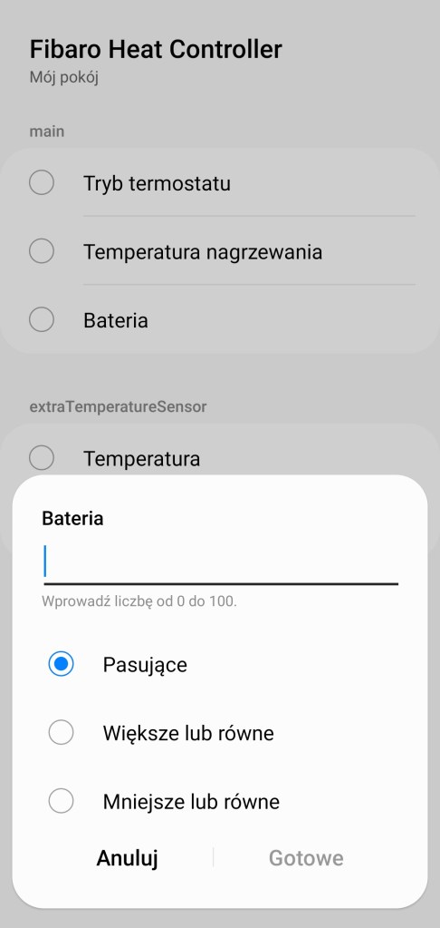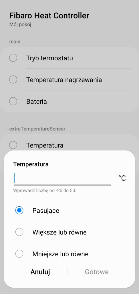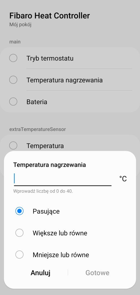 Tworzenie procedur (dawniej automatyzacje) „Jeśli … to Wtedy” musimy podzielić na dwa etapy, ponieważ znacznie różnią się dostępne opcje jeśli inicjujemy warunek „Jeśli”. Zauwąż, że posiadamy sekcję „main” dotyczącą głowicy oraz opcjonalną sekcje „extraTemperatureSensor”, gdzie znajdziemy opcje dotyczące czujnika temperatury. W pierwszej możliwości „Jeśli” urządzenie pozwala na wybranie opcji „Tryb termostatu”, gdzie mamy odczyt trybu głowicy, czyli alarm, nagrzewanie oraz wyłączenie. Następna jest „Temperatura nagrzewania” czyli powiadomienie o temperaturze z zakresu 0 – 40°C, w tym czy są większa/mniejsza niż odczytana. Informacja o poziomie baterii z zakresu 0 – 100% w tym czy jest większa/mniejsza. Zewnętrzny czujnik temperatury pozwala odczytać temperaturę z zakresu -20 – 50°C oraz informacje o poziomie baterii z zakresu 0 – 100% w tym czy jest większa/mniejsza.