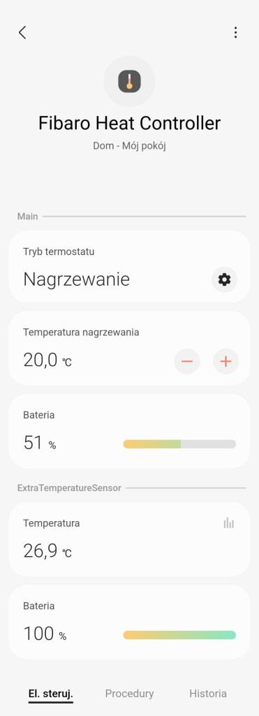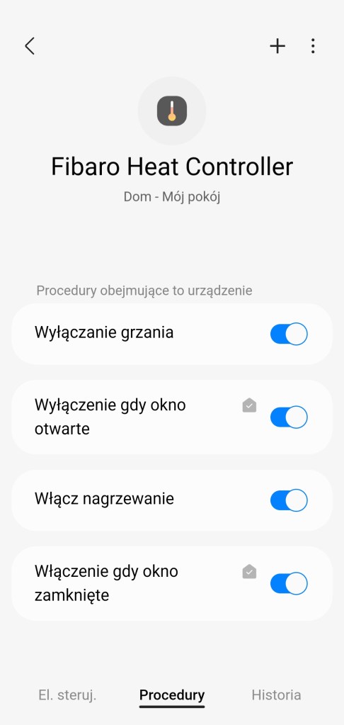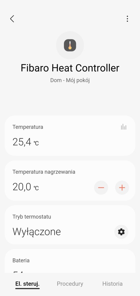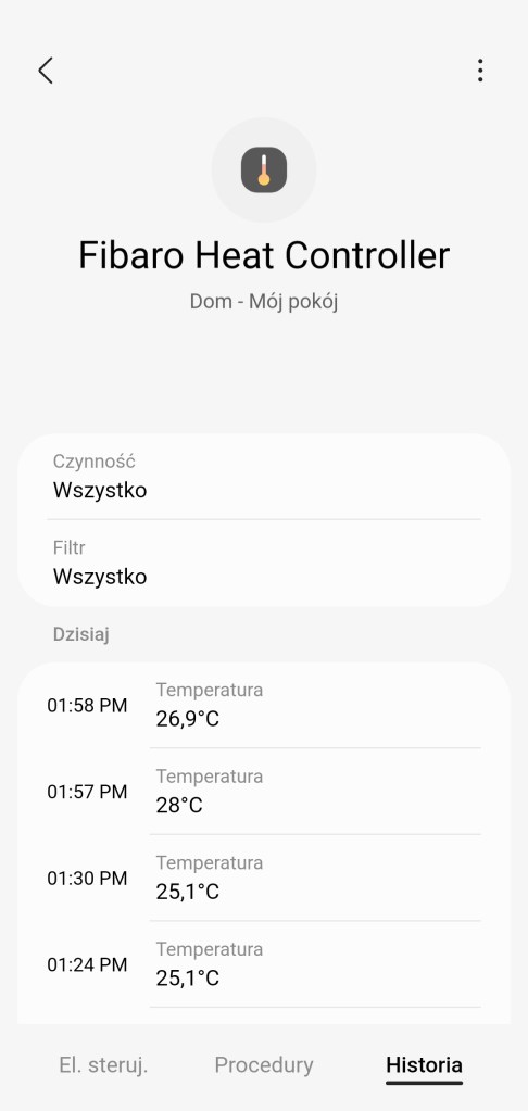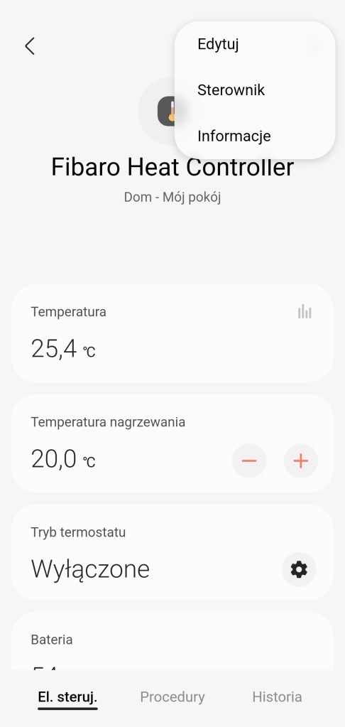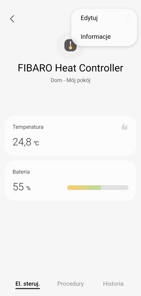 W pierwszej kolejności przyjrzymy się samemu Heat Controller. W głównym panelu aplikacji mamy informację o odczytanej temperaturze, możliwość nastawienia temperatury nagrzewania, ze skokiem co 1,0°C. Informację i możliwość zmiany trybu pracy głowicy: alarm, nagrzewanie oraz wyłączone. Procentową informacje o poziomie baterii głowicy. Na dole znajdziemy panel „Procedury” (dawniej „Automatyzacje„) znajdziemy tutaj wszystkie procedury w których wykorzystywane jest urządzenie. Panel „Historii” nie różni się znacznie od innych urządzeń, mamy dostęp do sortowania i przestudiowania historii działań termostatu. W ustawieniach „Edytuj” mamy standardową możliwość zmiany nazwy, lokalizacji, pokoju oraz możliwość dodania do panelu „Ulubione”.