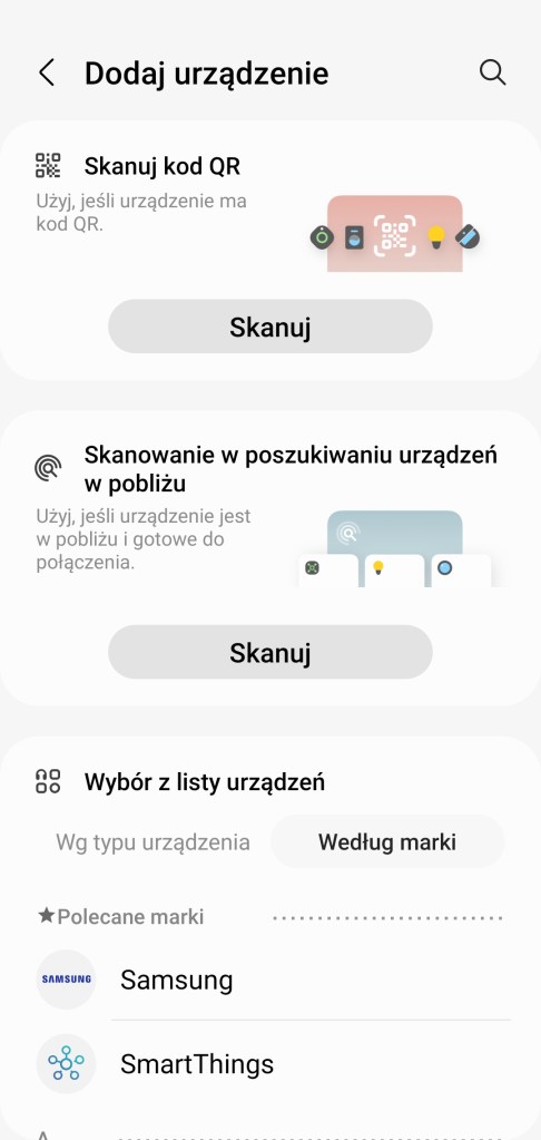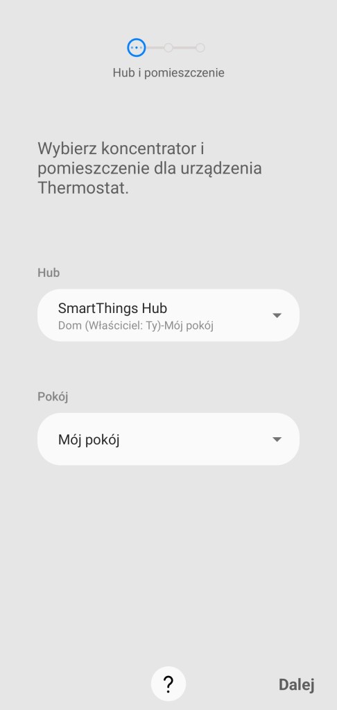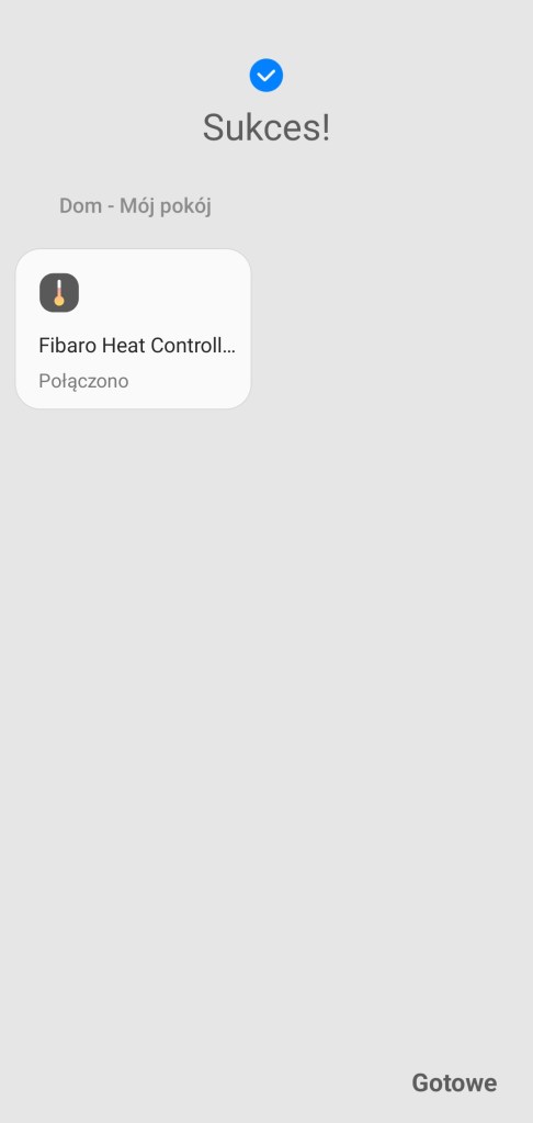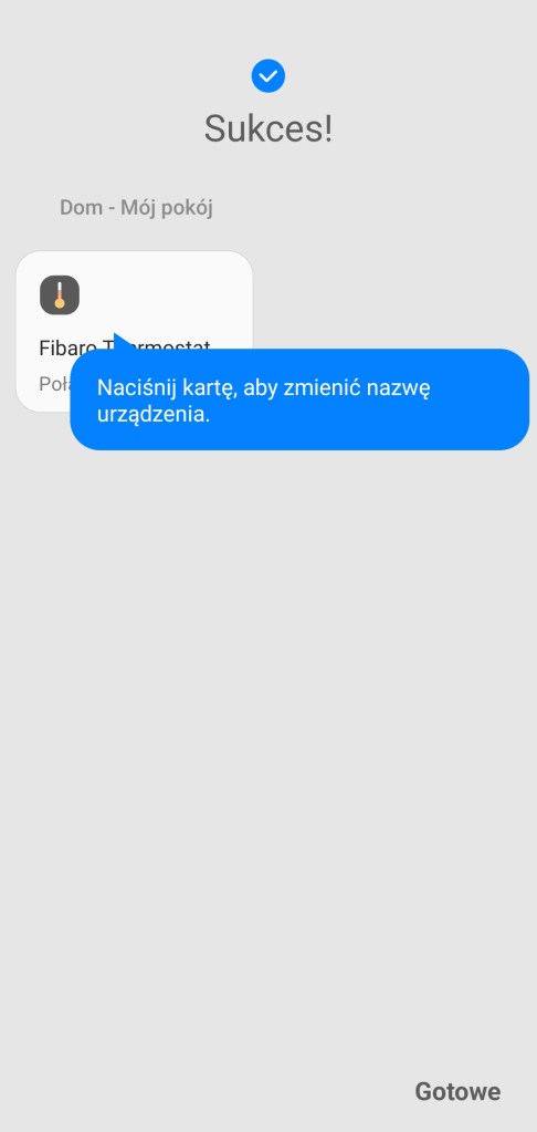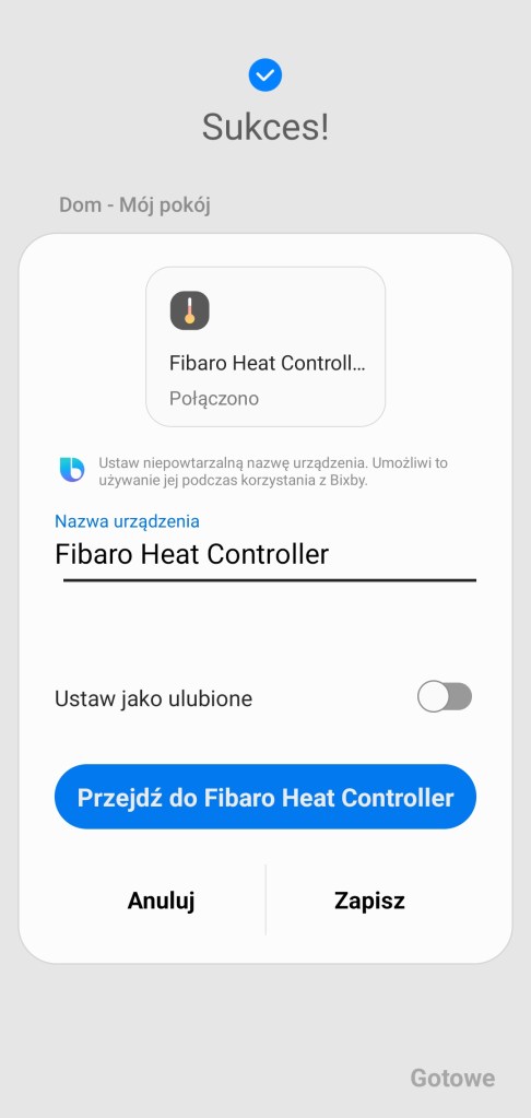 Kiedy mamy już zamontowaną głowice przy kaloryferze, możemy przejść do dodania urządzenia do ekosystemu SmartThings. Dodanie do ekosystemu jest proste należy postępować zgodnie z instrukcją w aplikacji SmartThings. Klikamy na ekranie głównym przycisk Dodaj ( + ), w prawym górnym rogu ekranu. Następnie Urządzenie, przesuwamy w dół do sekcji marek Wybór z listy urządzeń, wyszukujemy markę FIBARO, wybieramy Termostat. Kontynuujemy pierwsze kroki, wybierając centralę i pomieszczenie, w jakim ma się zaleźć urządzenie. Następnie szybko trzykrotnie klikamy przycisk na urządzeniu, aż pierścień LED zacznie migać na biało. Możemy zeskanować kod QR lub wprowadzić PIN, my korzystamy z drugiej opcji. W celu bezpieczeństwa będziemy musieli znaleźć kod, który znajdziemy na głowicy. Po poprawnym wpisaniu, zacznie się proces łączenia. Po wykryciu pozostaje już tylko nadać nazwę głowicy i kliknąć Gotowe.