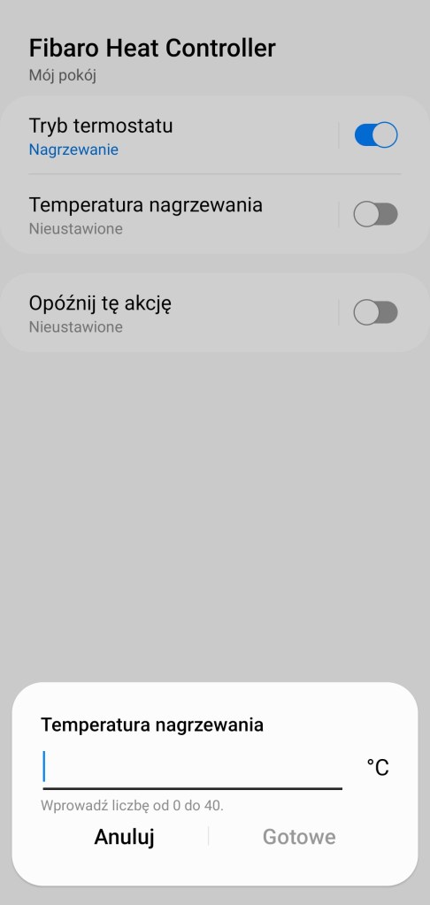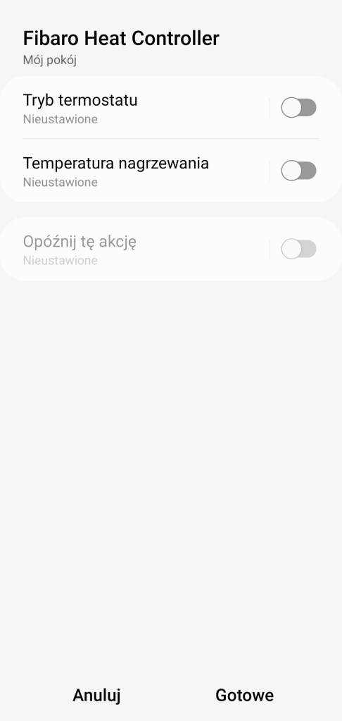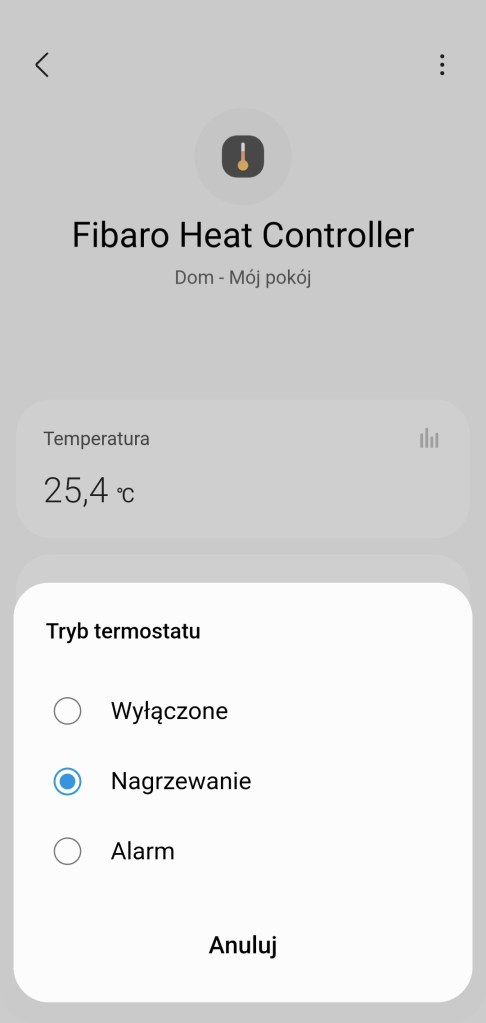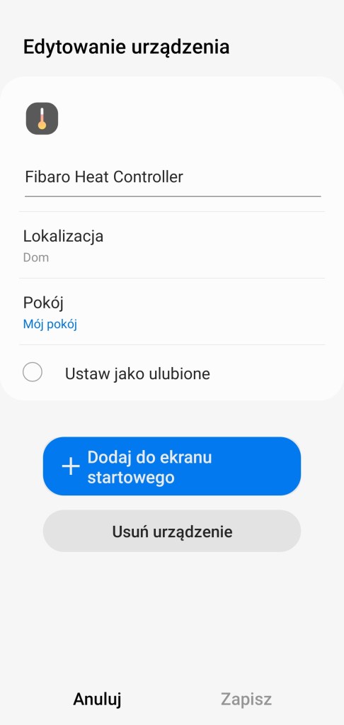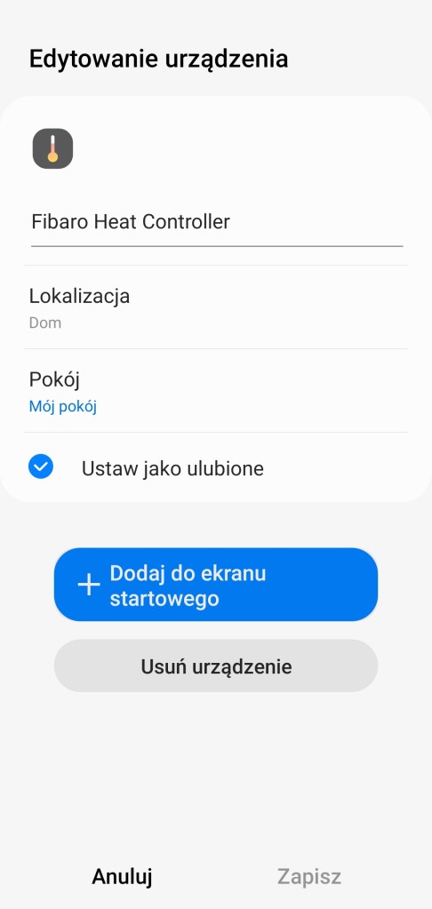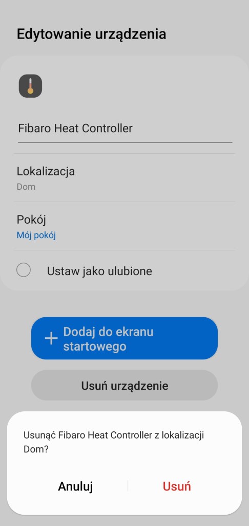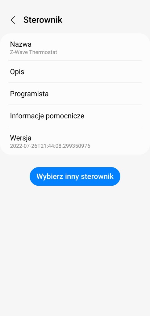 Niestety aby to zrobić musimy usunąć urządzenie z ekosystemu SmartThings a następnie je ponownie dodać. Instrukcja usunięcia poniżej w akapicie. Na poniższych screenach znajdziecie błąd jaki pojawia się przy użyciu starego sterownika Grovy. Nie mamy tutaj możliwości nastawienia temperatury nagrzewania. Następne sceeny już pochodzą po zmianie sterownika, możemy zauważyć nową opcje Sterownik, a w niej dodatkowe szczegóły. Świadczy to o używaniu nowego sterownika.