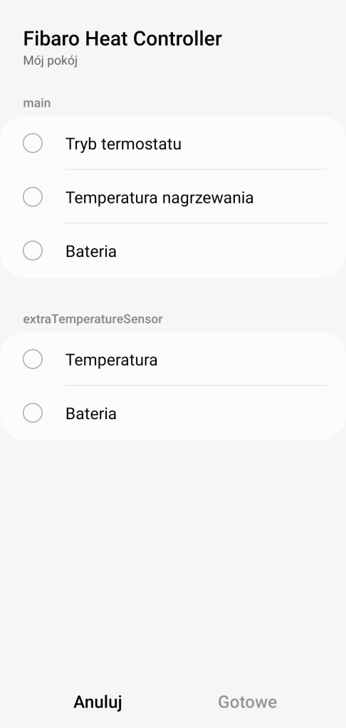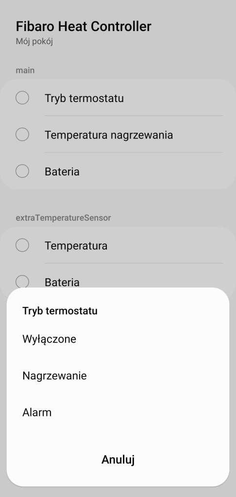 Po dodaniu zewnętrznego czujnika temperatury Temperature Sensor, zmiana nam się panel główny aplikacji prezentuje nam teraz w odrębnej sekcji „extraTemperatureSensor” dodatkowo informację o zmierzonej temperaturze oraz obecnym poziomie baterii czujnika. Muszę zaznaczyć, że czujnika nie dodajemy do systemu. Łączy się on bezpośrednio z głowicą, instrukcja znajduje się poniżej. Dopiero po sparowaniu z Heat Controller, dodtkowe odczyty czujnika pojawią się w naszej aplikacji SmartThings. Możemy zauważyć, że tracimy odczyt temperatury z głowicy.