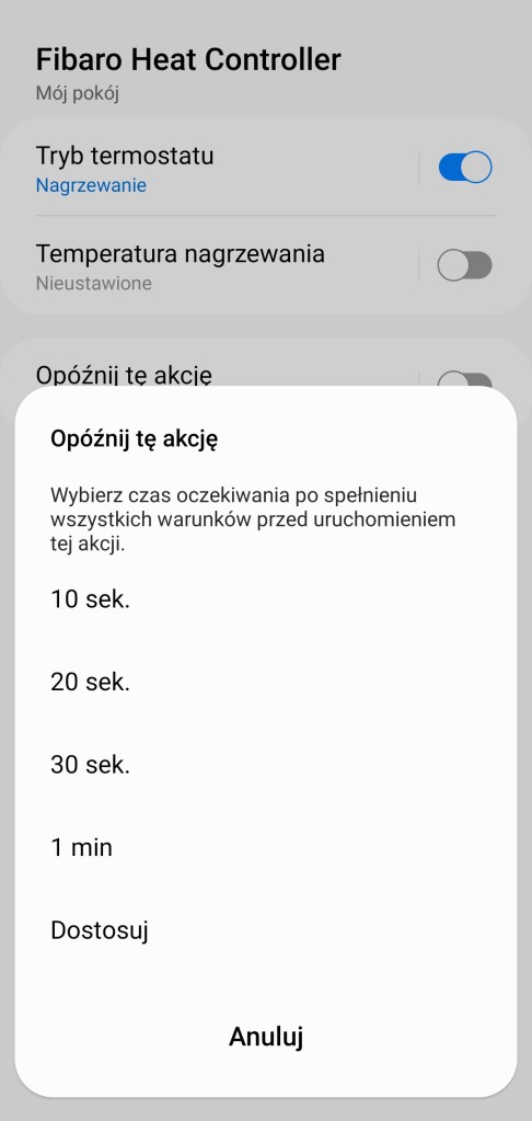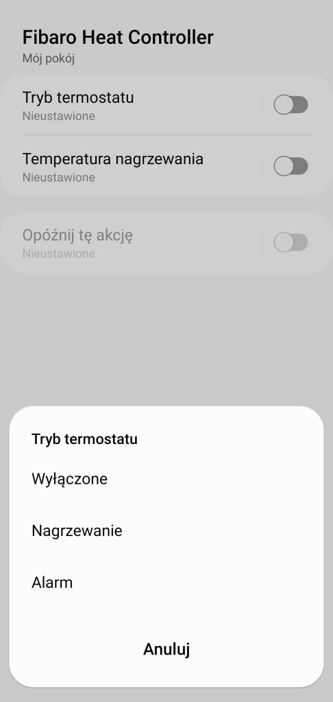 W drugiej możliwości „Wtedy”, mamy możliwość skorzystania już tylko z możliwości głowicy termostatycznej. Możemy wymóc zmianę trybu pracy głowicy: alarm, nagrzewanie oraz wyłączenie, nastawić temperaturę nagrzewania w pokoju, w zakresie 0 – 40°C oraz możliwość dowolnego opóźnienia tych czynności o zadaną jednostkę czasu.