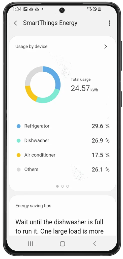 Oszczędzanie energii ma teraz większe znaczenie niż kiedykolwiek. Nie tylko w trosce o środowisko i przyszłość kolejnych pokoleń, lecz również jako ratunek dla stale zwiększających się cen energii elektrycznej. Usługa SmartThings Energy pozwala użytkownikom przejąć kontrolę nad zużyciem energii, dostarczając w czasie rzeczywistym szczegółowe i dokładne informacje o tym, gdzie i jak energia jest wykorzystywana w ich domu. Usługa mierzy poziomy energii w kilowatogodzinach i koszty w czasie, dzięki czemu każdy użytkownik może łatwo zrozumieć, ile energii zużywa urządzenie. Usługa oferuje również konkretne wskazówki dotyczące zmniejszania zużycia energii i zachęca użytkowników do włączania ekologicznych działań do ich codziennego życia. Ponadto włączenie trybu oszczędzania AI pomaga zmniejszyć zużycie energii, automatycznie przełączając urządzenia w tryb oszczędzania energii po osiągnięciu określonego zużycia energii.