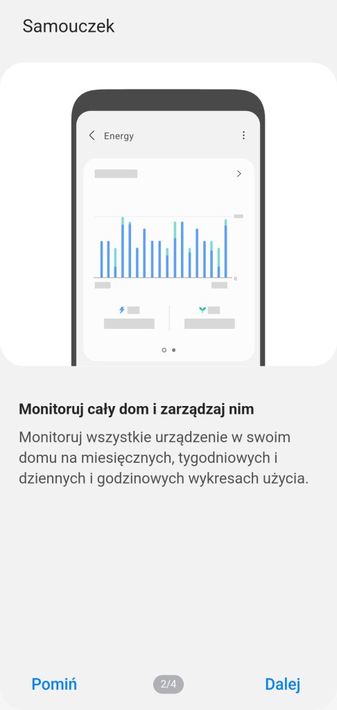 Aby dodać usługę do naszej aplikacji SmartThings, przejdź do ekranu głównego, następnie klikamy Dodaj ( + ) w prawym górnym rogu ekranu, kolejno stuknij Dodaj usługę, z dostępnej listy wybierz Energy. Nastąpi pobranie i zainstalowanie dodatku do aplikacji. Następnie uruchomi się krótki samouczek, możemy go pominąć klikając Pomiń lub dokończyć klikając kilkakrotnie Dalej. Kończymy proces stukając Rozpoczęcie. Od teraz usługa będzie działać wraz z aplikacją.