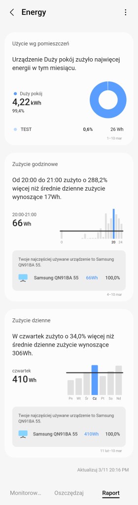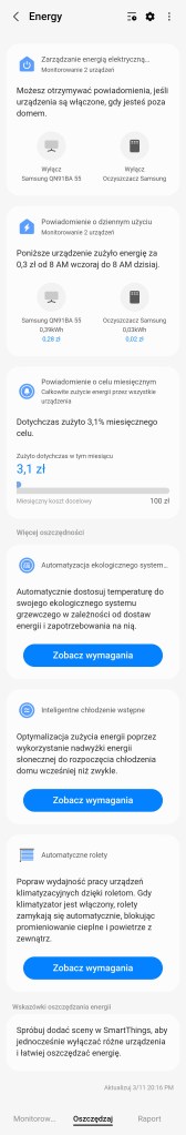 - [Aktualizacja 2]: Na początku roku 2023 naprawiono błąd z brakiem sczytywania danych o energii z telewizora Samsung QN91BA. Zaktualizowano layout usługi. Dodano nowe screeny z aplikacji SmartThings. Wersja Energy to 5.0.15.